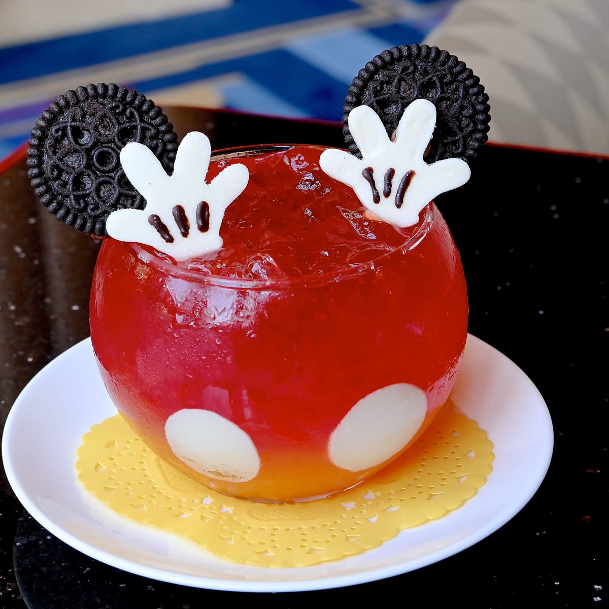 上にストロベリーゼリー、ミッキーの手(チョコレート)、ミッキーのお耳(ココアクッキー)がトッピングされています☆
