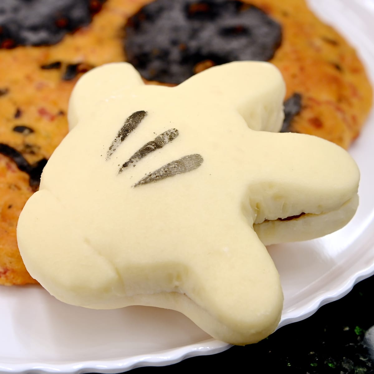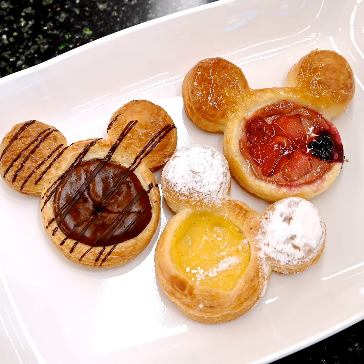 ミッキーグローブ型のチョコレートクリームとラズベリーのブレッドが提供されています。