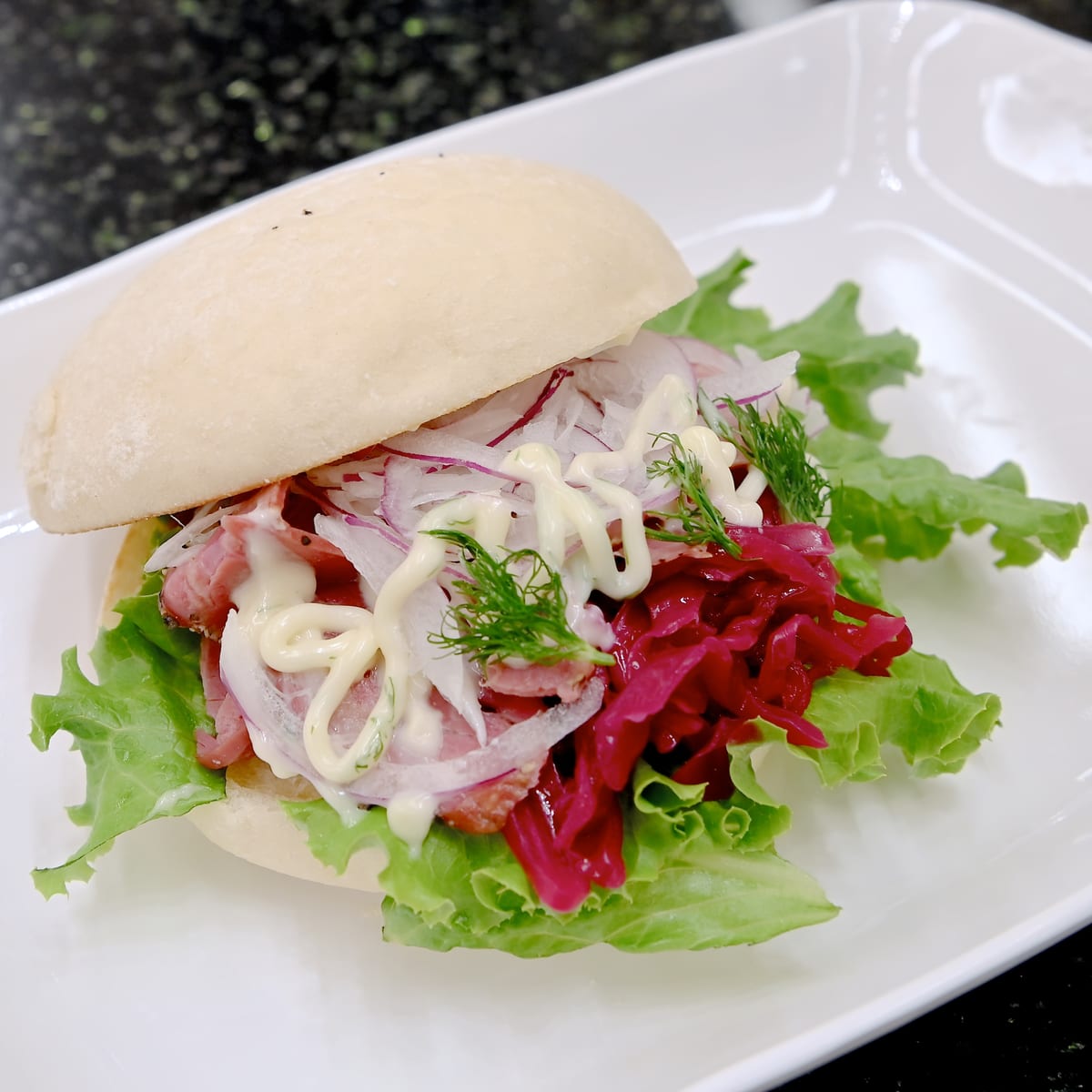 メインは、クリスマスカラーのパストラミビーフとレッドキャベツのサンドウィッチ☆