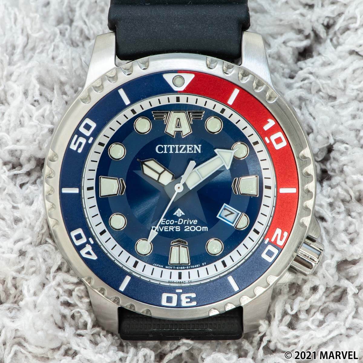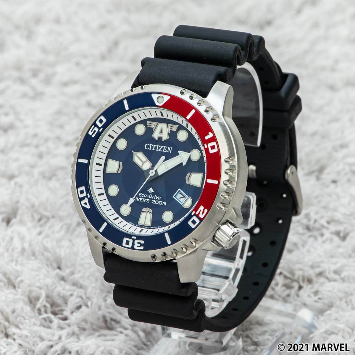 Marvel(マーベル)デザインは「キャプテン・アメリカ」モチーフの赤と青のカラーリングの腕時計。