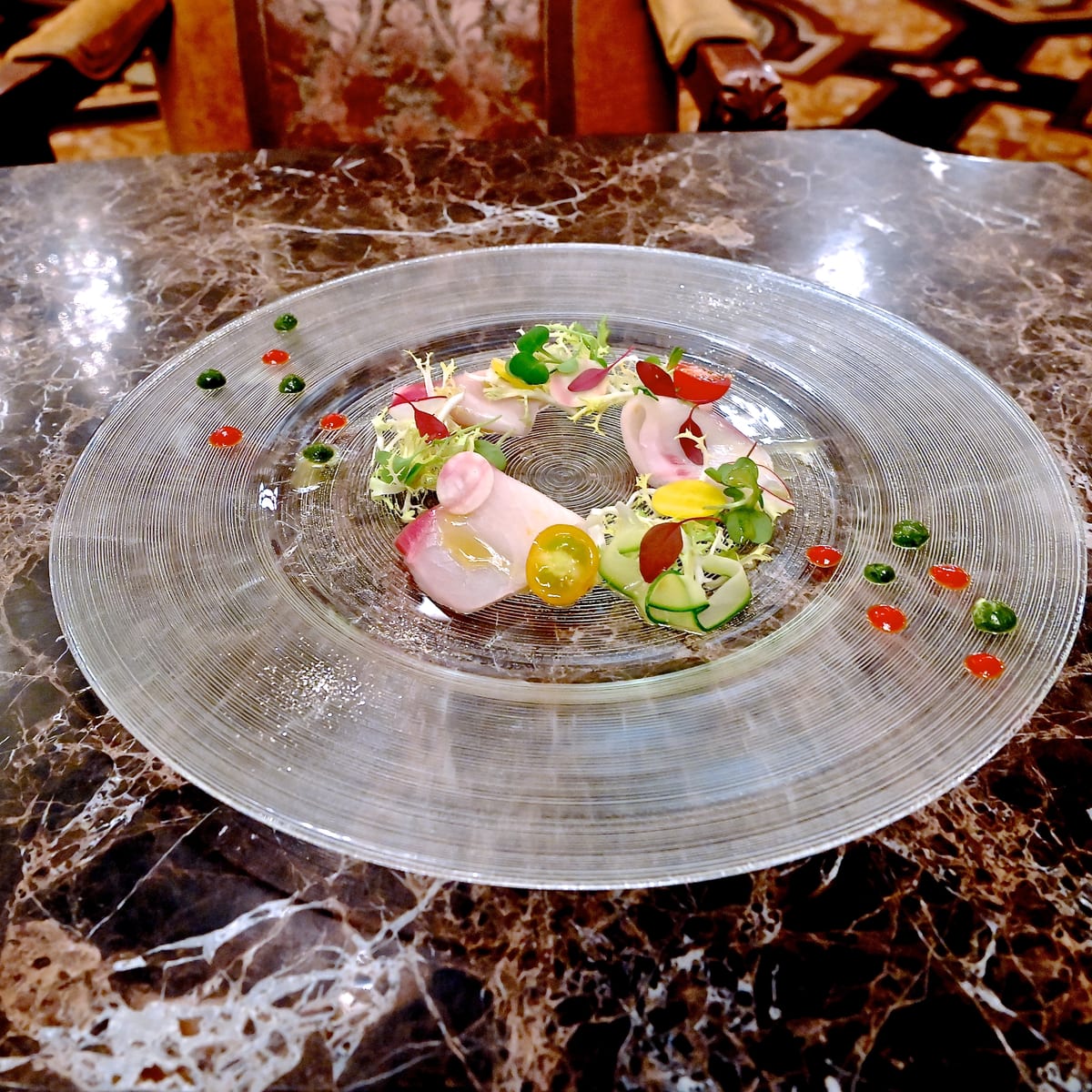 前菜はブリのカルパッチョ仕立て 柚子胡椒のアクセント。