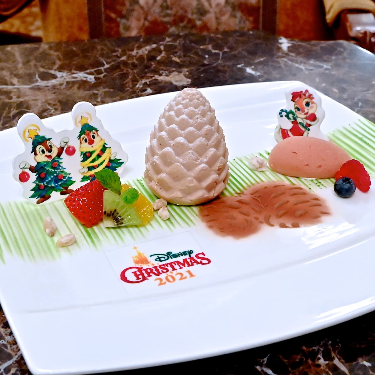 デザートは“ディズニー・クリスマス2021”のロゴがデザインされたクリスマスカラーのプレートで登場。