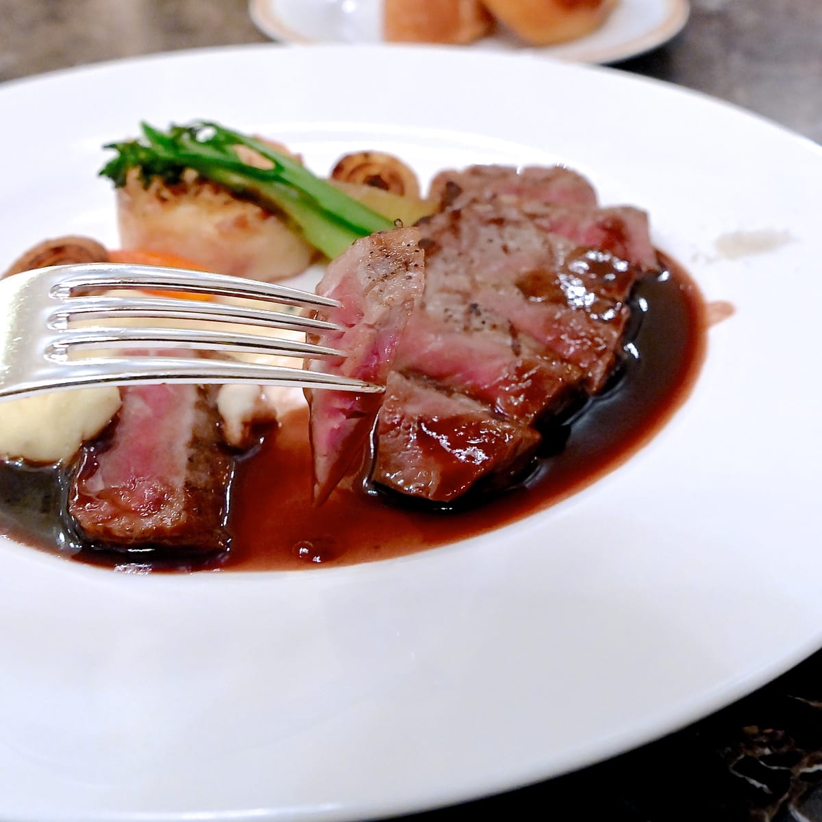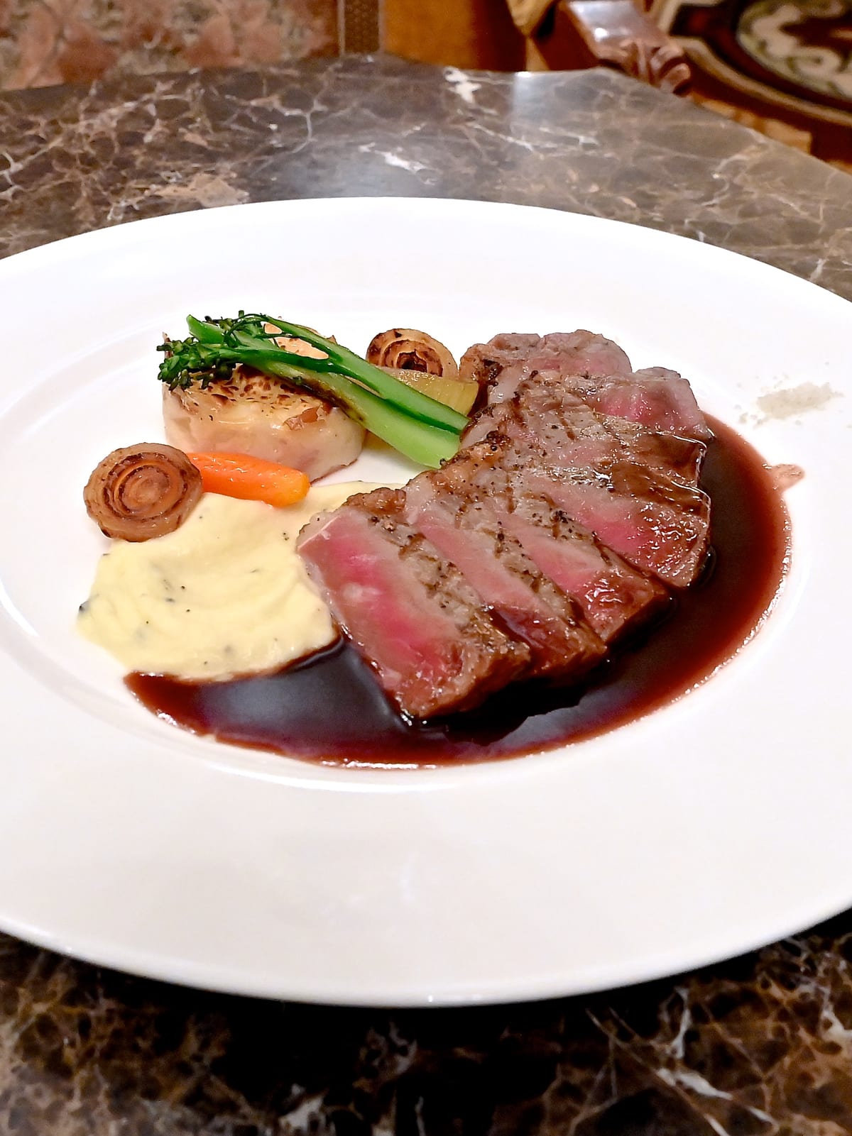 牛サーロインのグリルとサルシフィーのグラタン マルサラソース