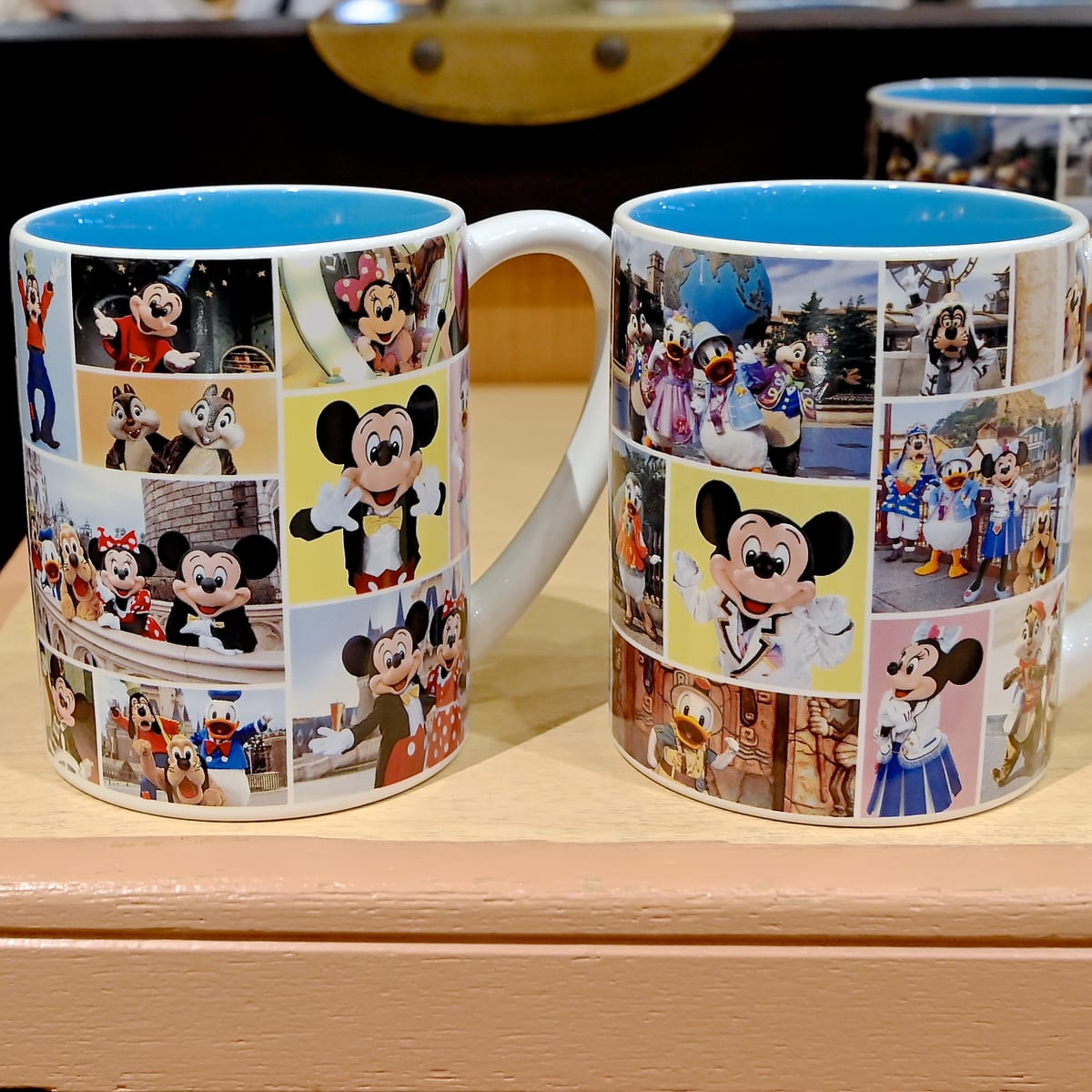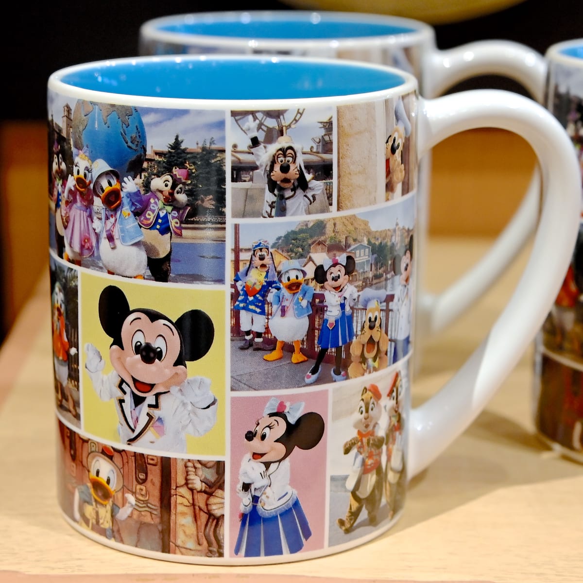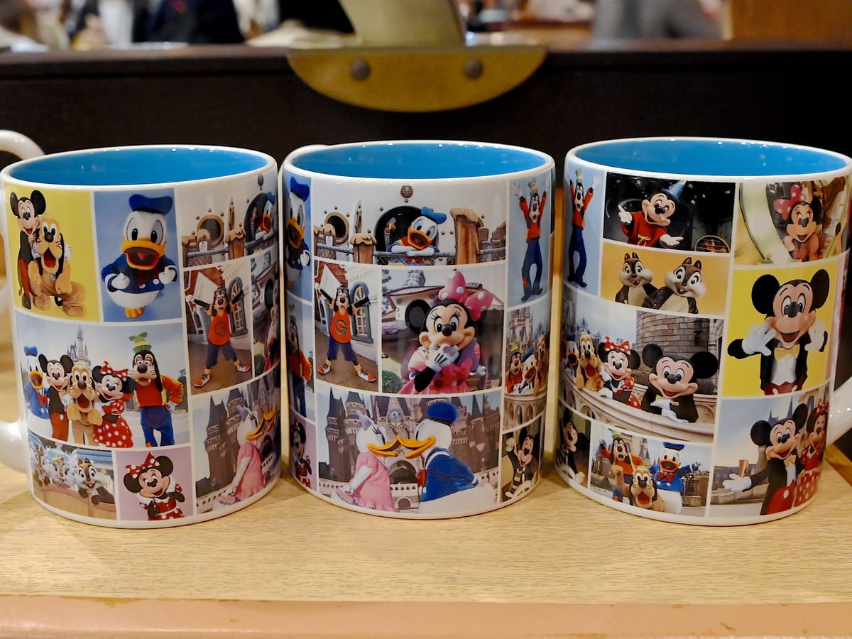 東京ディズニーランド、東京ディズニーシーで会えるキャラクターがデザインされたカラフルなマグカップ。