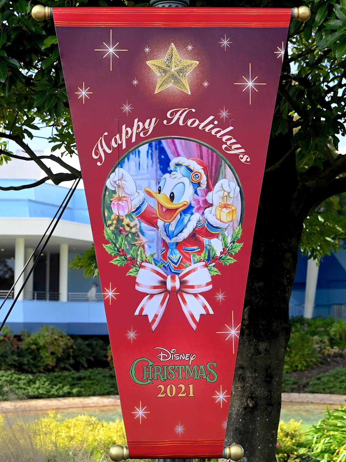 オーナメントを飾りつけているドナルドダックのバナー、