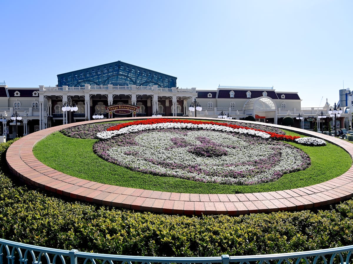 東京ディズニーランドに入ってすぐに目がいくのは、サンタコスチュームのミッキーマウスがデザインされたクリスマスならではのミッキー花壇!