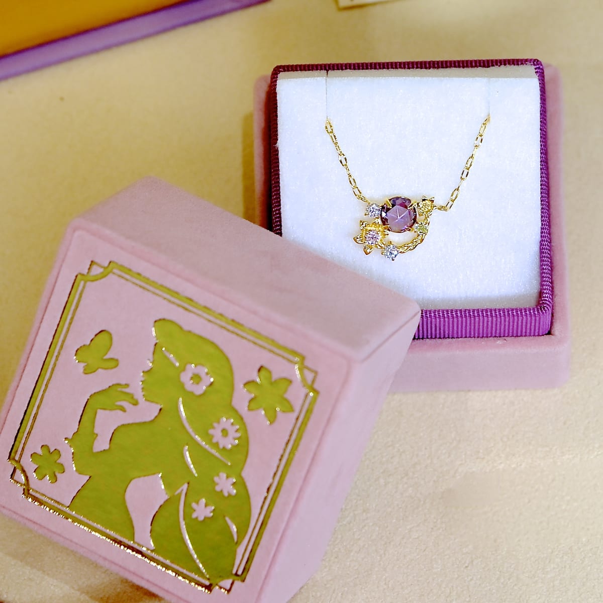 ディズニー映画『塔の上のラプンツェル』をイメージした魔法の花や三つ編みモチーフのネックレス。