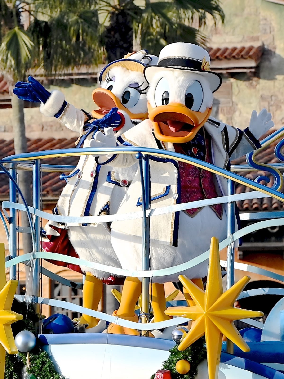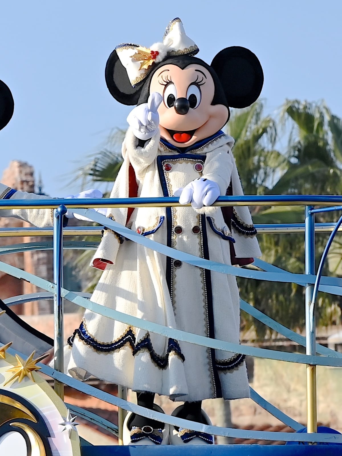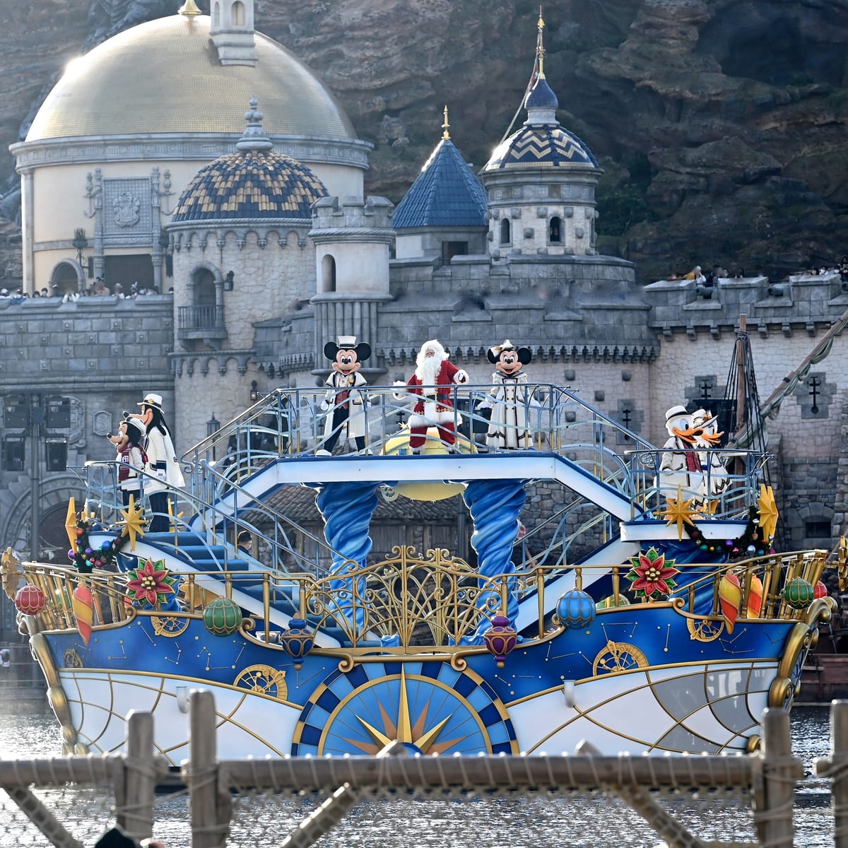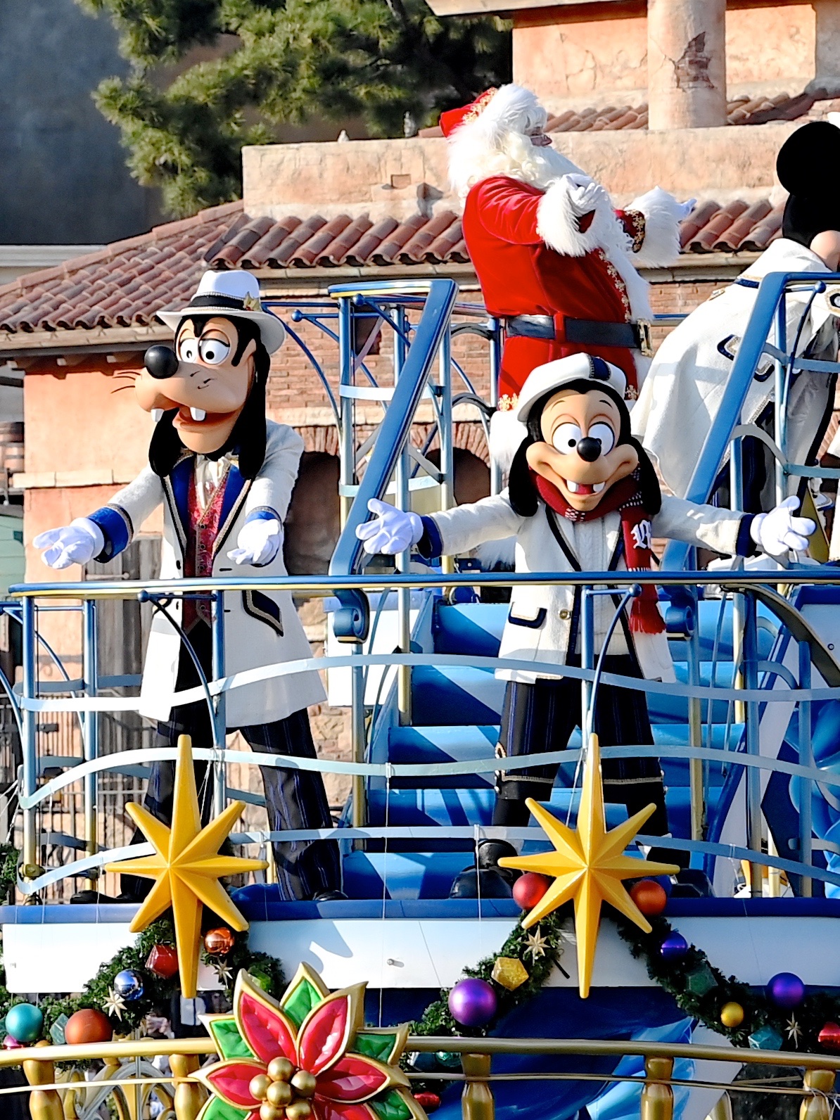クリスマスの装いのミッキーマウスたちが船の上からゲストにごあいさつしてくれます☆