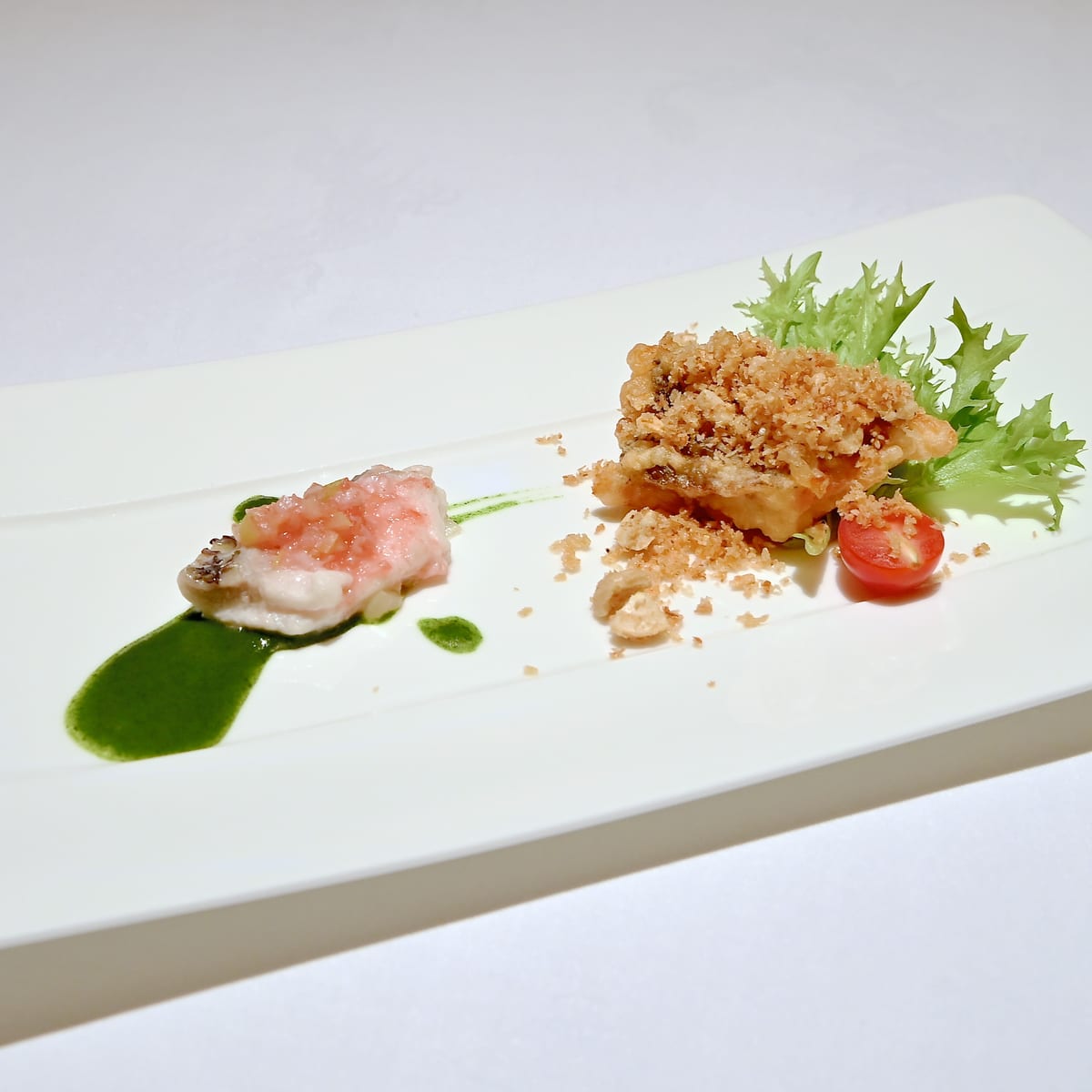お魚料理は、真鯛の紅麹蒸しと真鯛の唐揚げ ガーリックソルト。