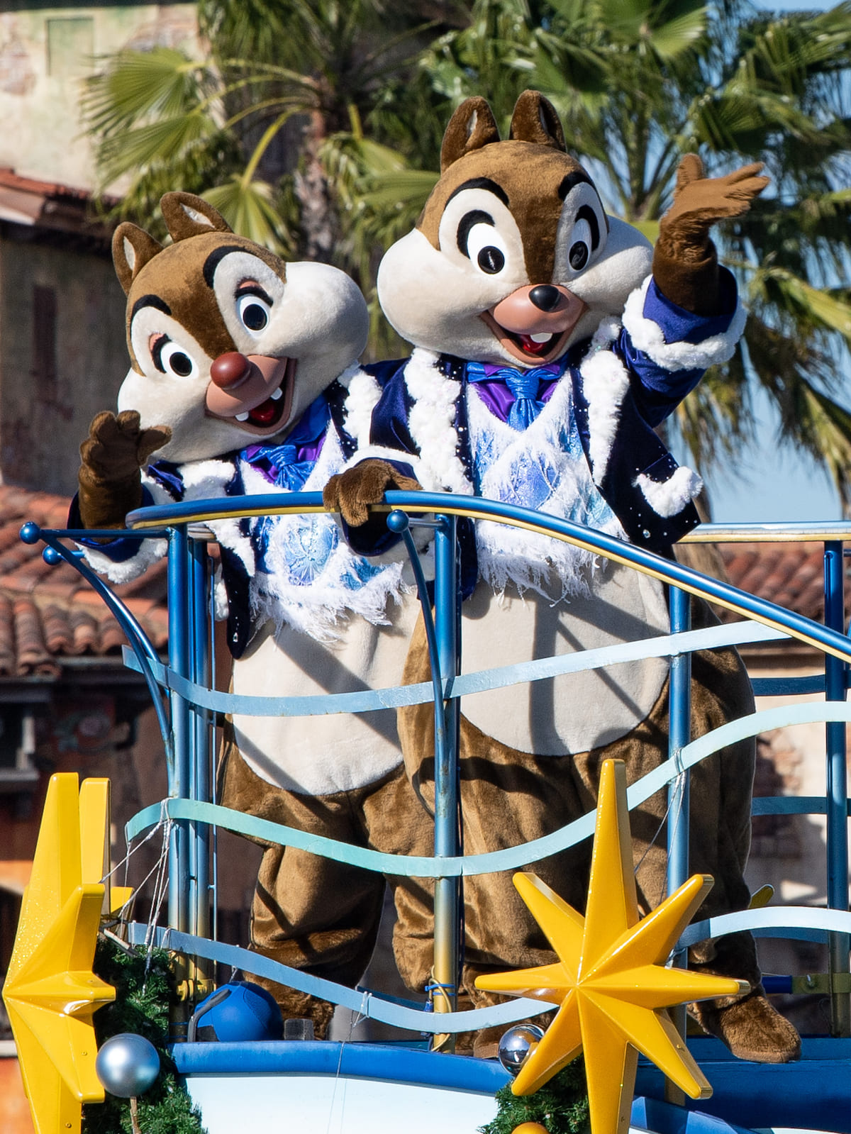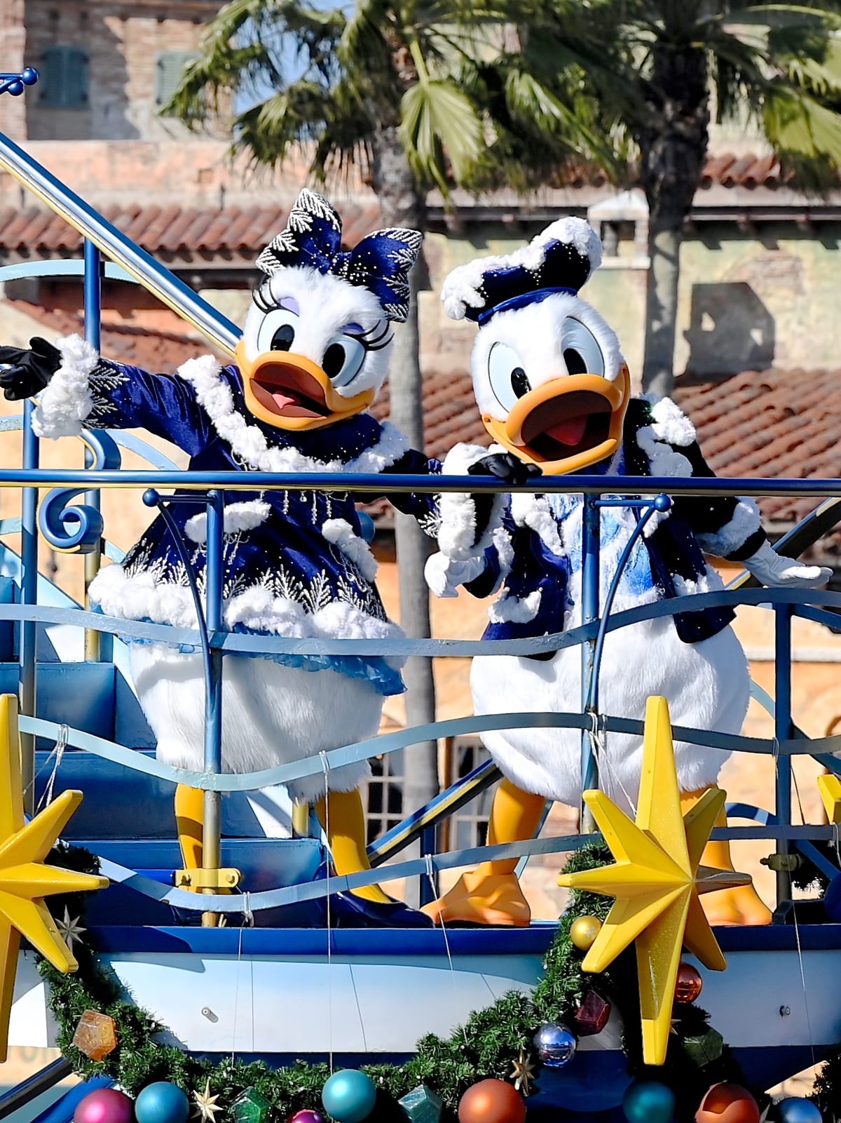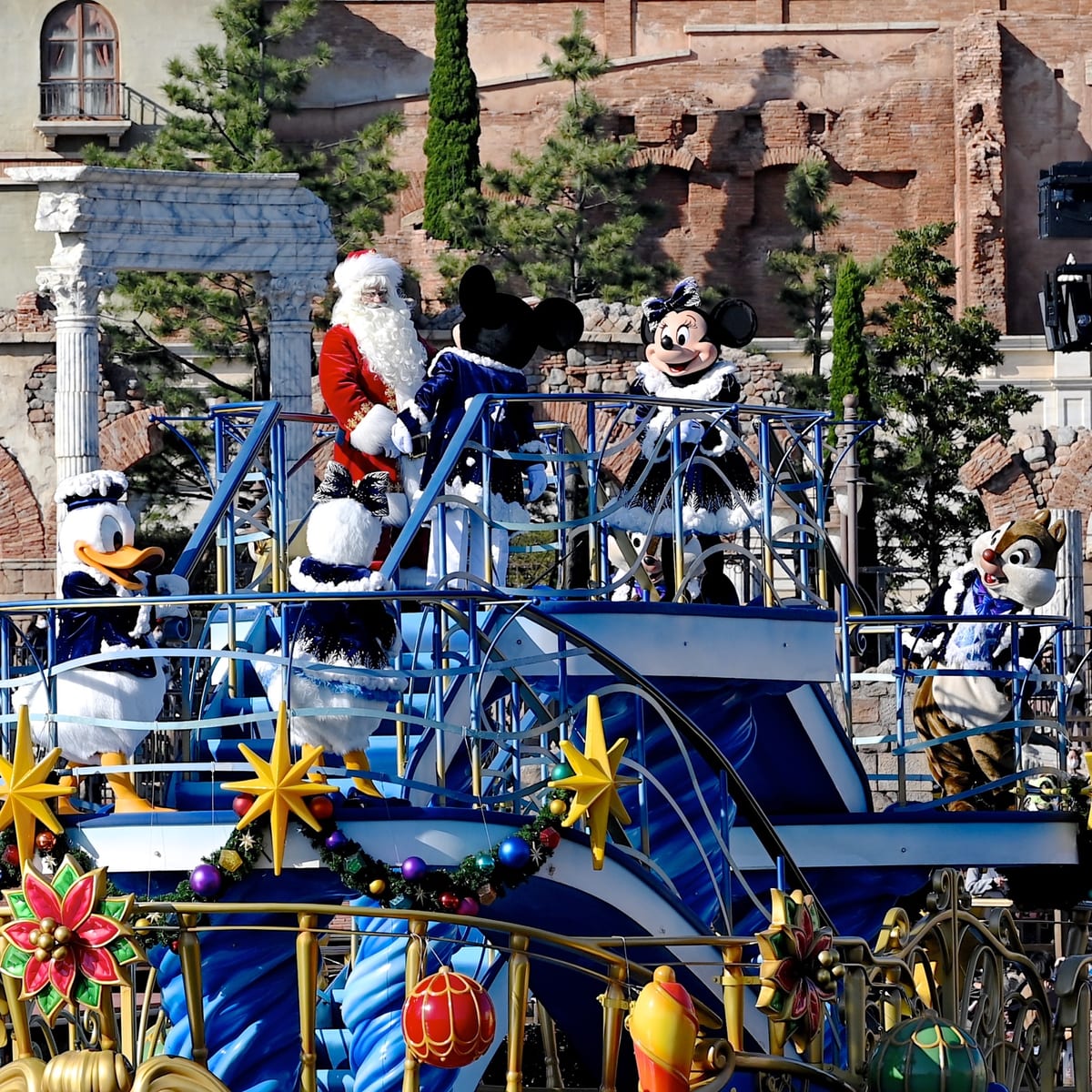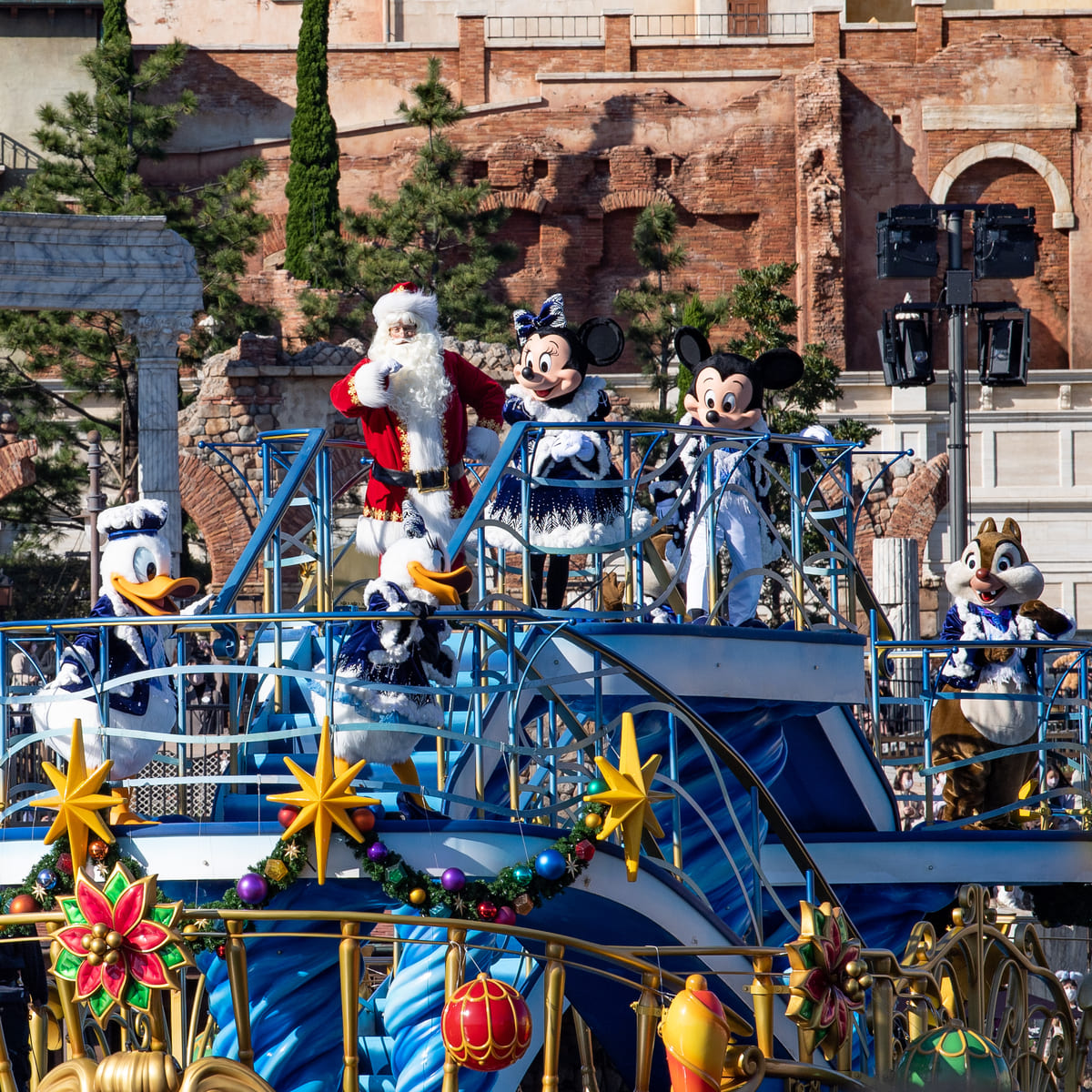 クリスマスの装いのミッキーマウスたちが船の上からゲストにごあいさつしてくれます☆
