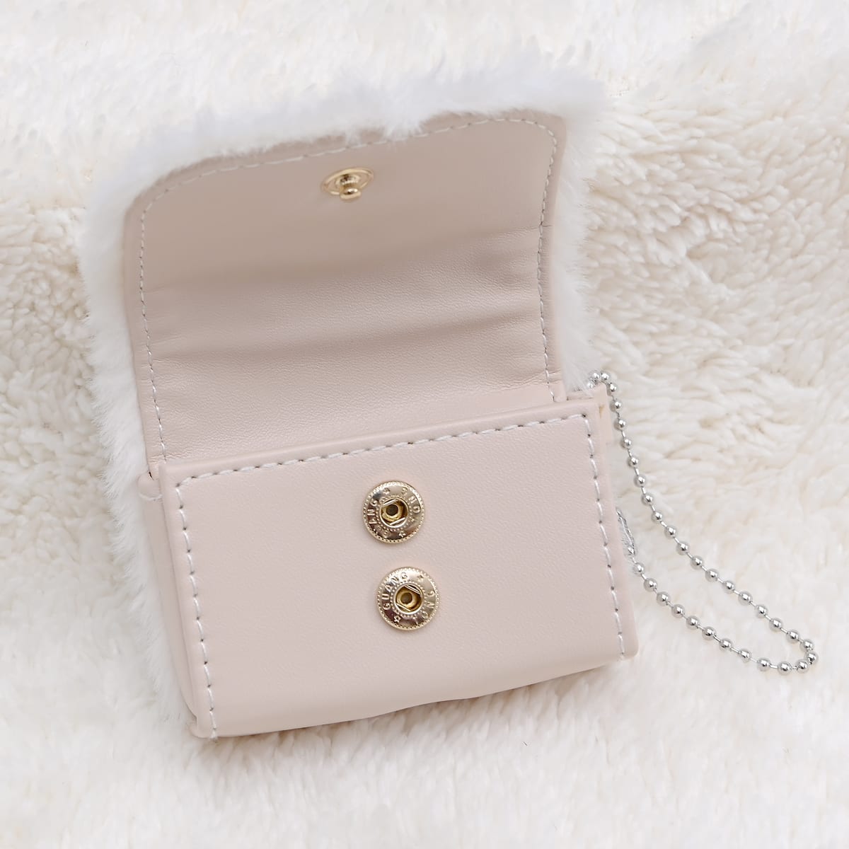 オフホワイトのフェイクファーとロイヤルミルクティー色のレザー風素材を組み合わせた異素材使いです。