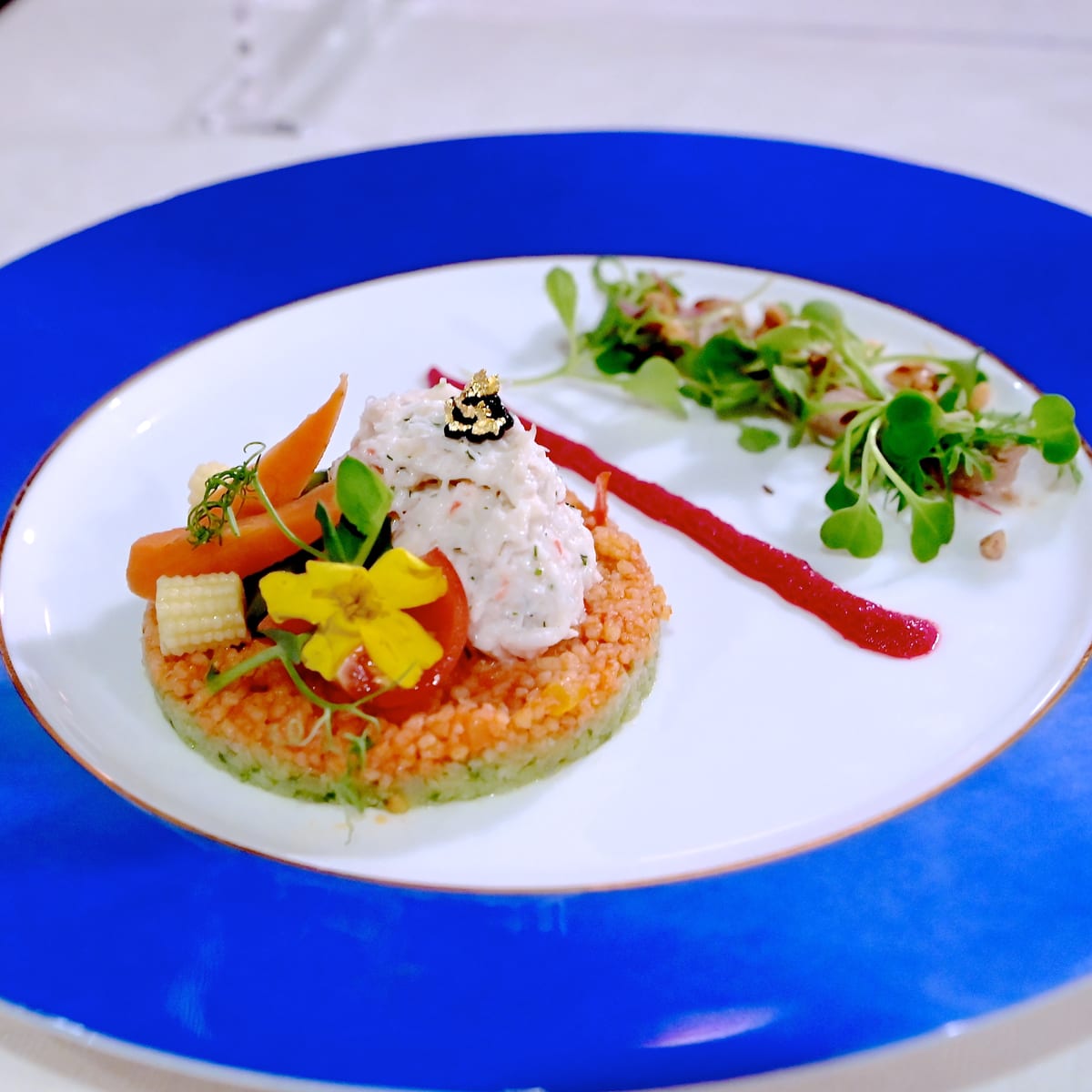 ズワイガニのサラダ、クスクスのガレットとビーフムース、アーモンド添え