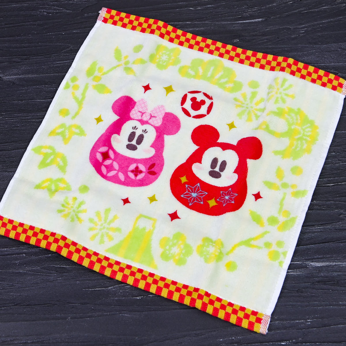 ミッキー&ミニーモチーフのだるまがデザインされた「謹賀新年」の文字入り帯付きミニタオル。