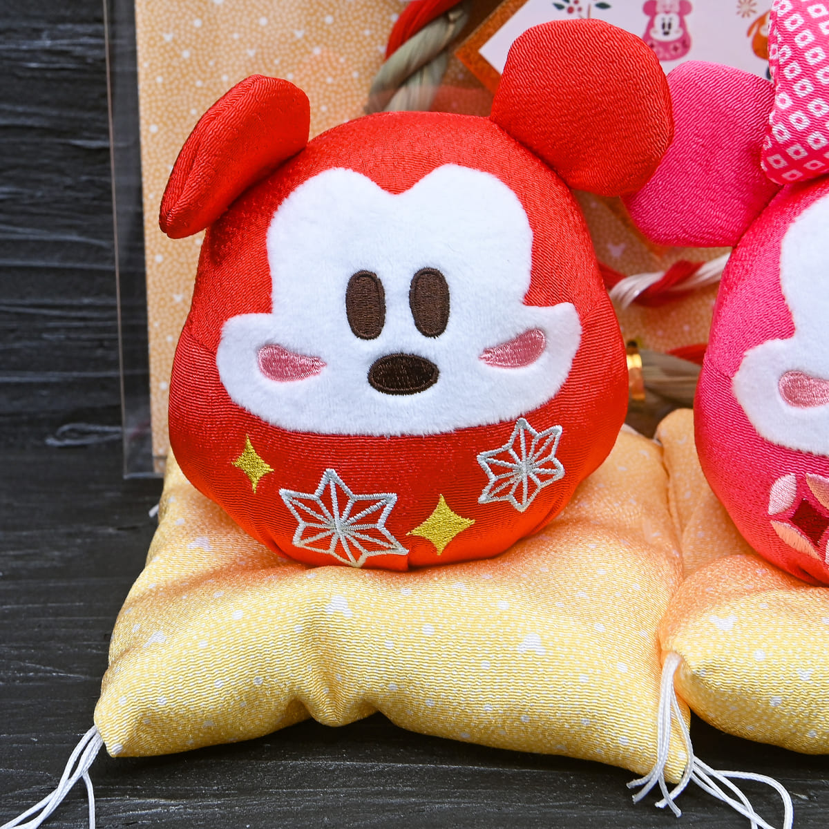 色鮮やかで豪華なミッキー、ミニーモチーフのだるまデザインぬいぐるみ。
