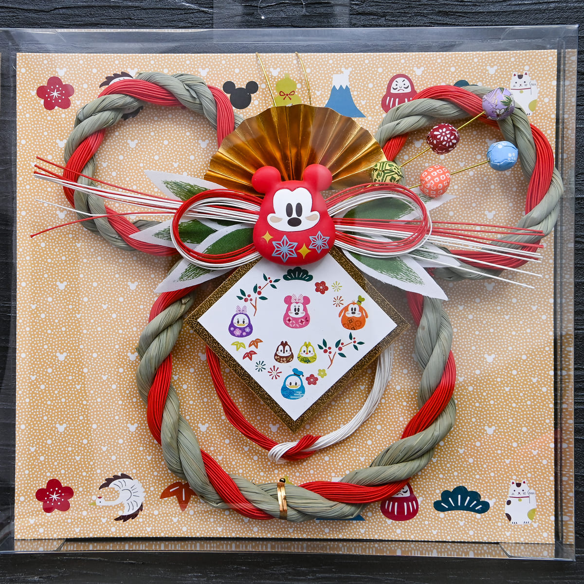 ミッキーシェイプのしめ縄に、ミッキーモチーフのだるま、扇、紅白の水引きが飾られています。