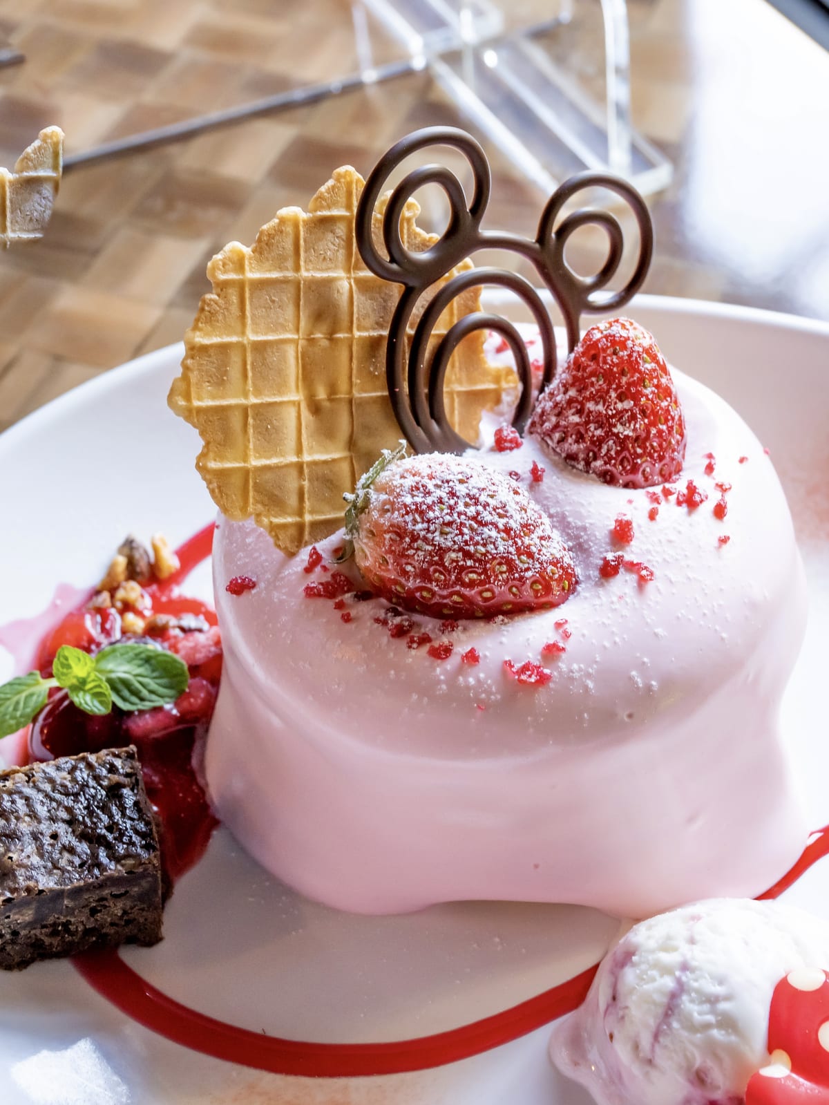 かわいいミニーマウスのお顔型は、甘酸っぱいラズベリームースと濃厚なストロベリーアイス。