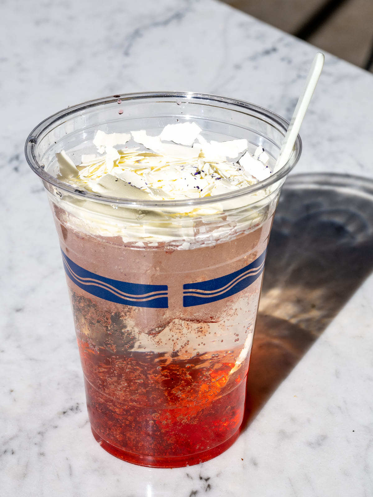 東京ディズニーシー/アメリカンウォーターフロントにあるデリカフェ「ニューヨーク・デリ」ではスパークリングカクテル(ホワイトワイン&チェリーフレーバー)を提供。