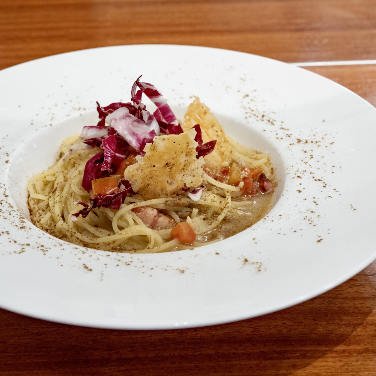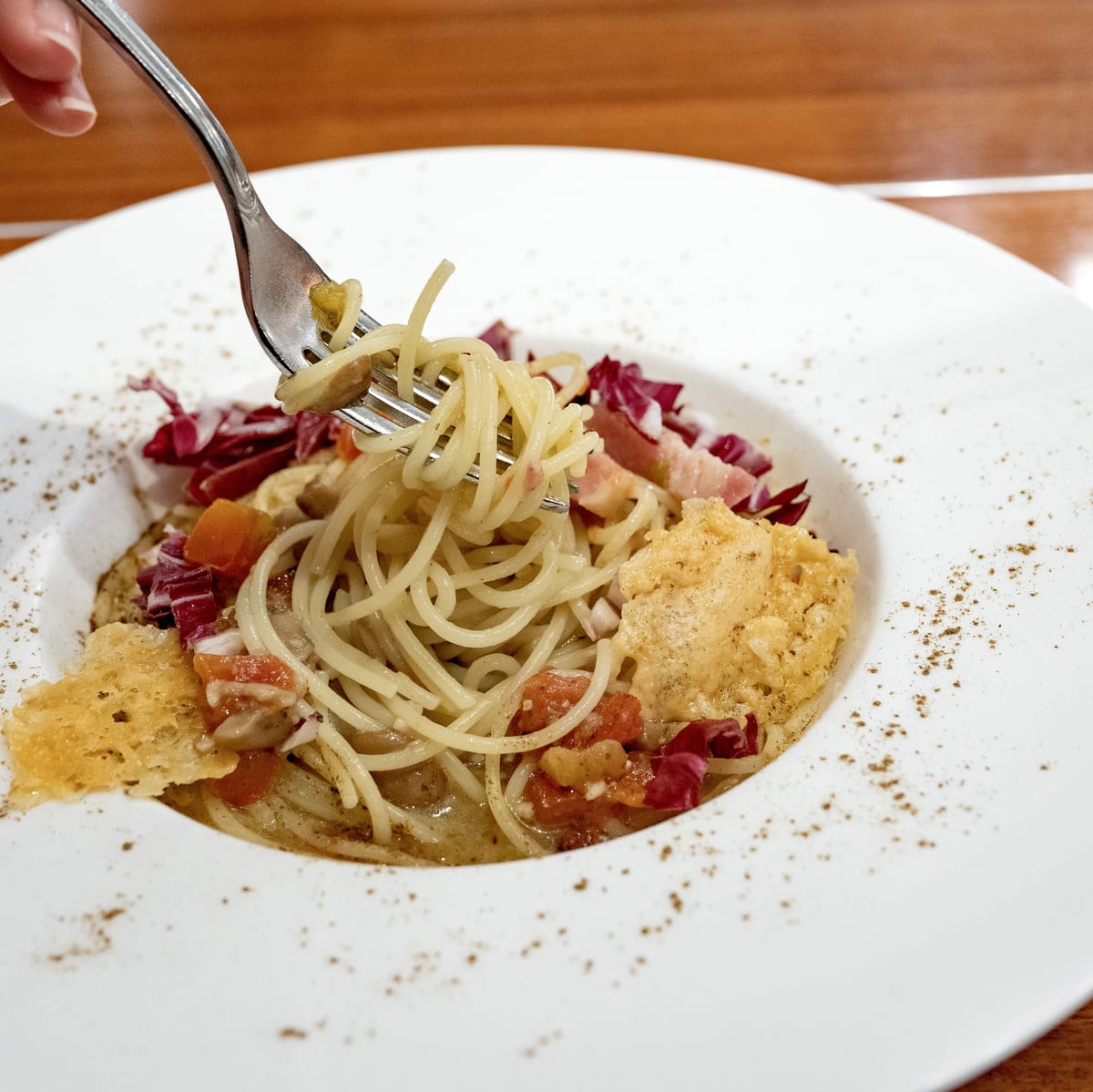 - スパゲッティーニ、パンチェッタとキノコのクリームソース ポルチーニの香り