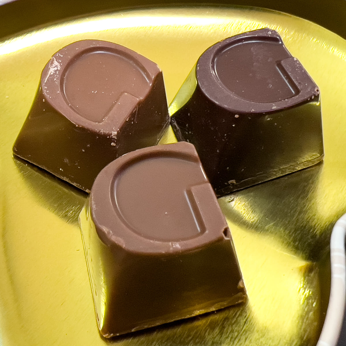 印象的な「G」が施されたチョコレートで、ミルクヘーゼルナッツ、ダークバニラ、ミルクソルテッドキャラメルの3種類が楽しめます。