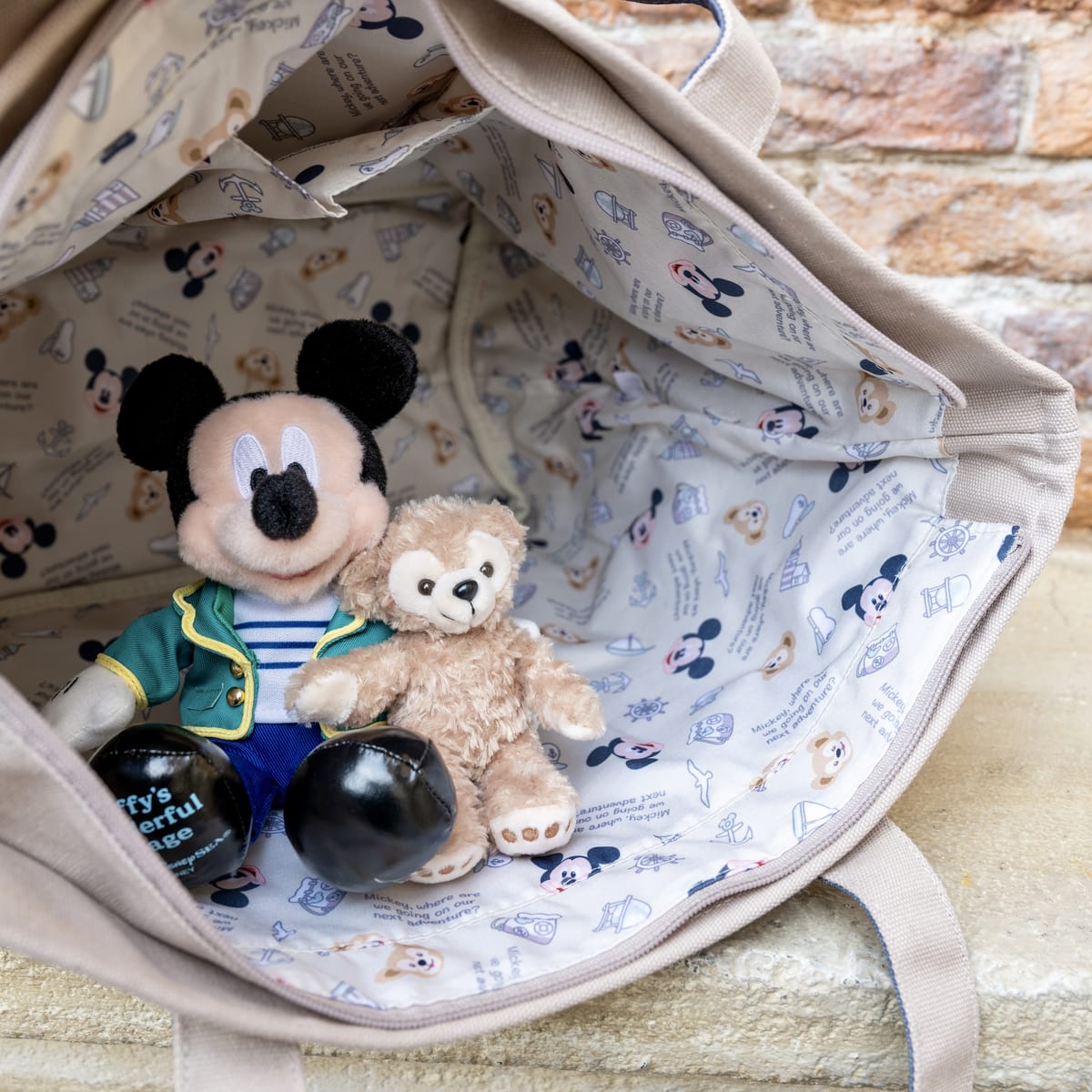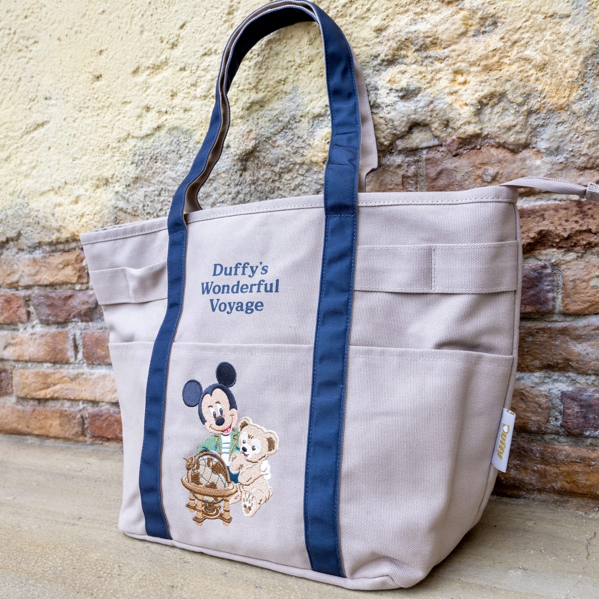 ミッキーマウスとダッフィー、ダッフィーのワンダフル・ヴォヤッジの文字がデザインされた大容量のトートバッグ。