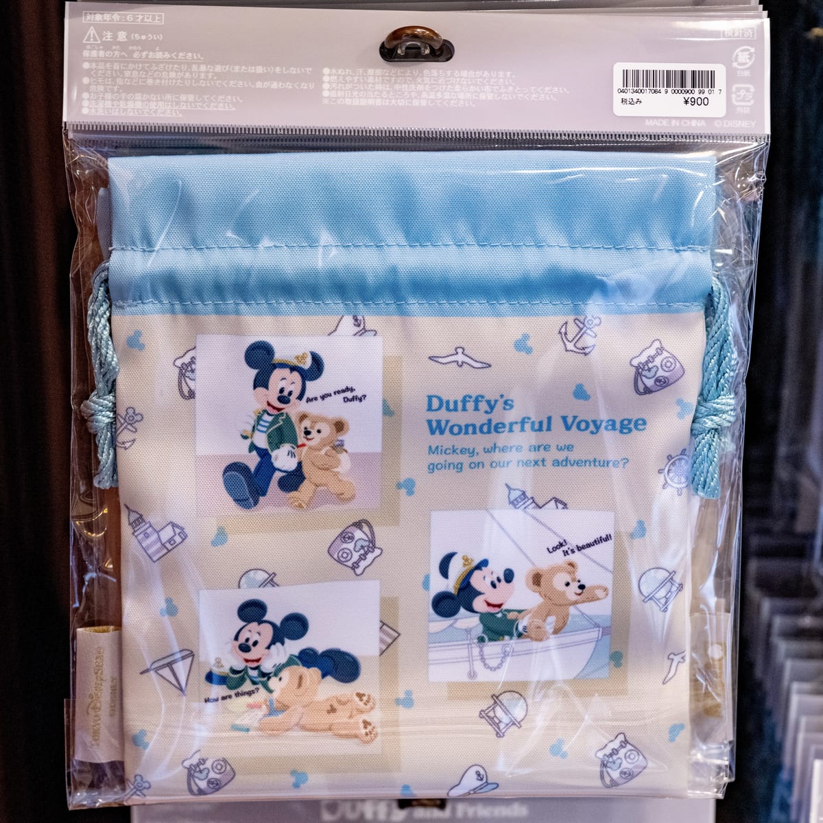 ダッフィーのワンダフル・ヴォヤッジのストーリーが描かれたきんちゃく。