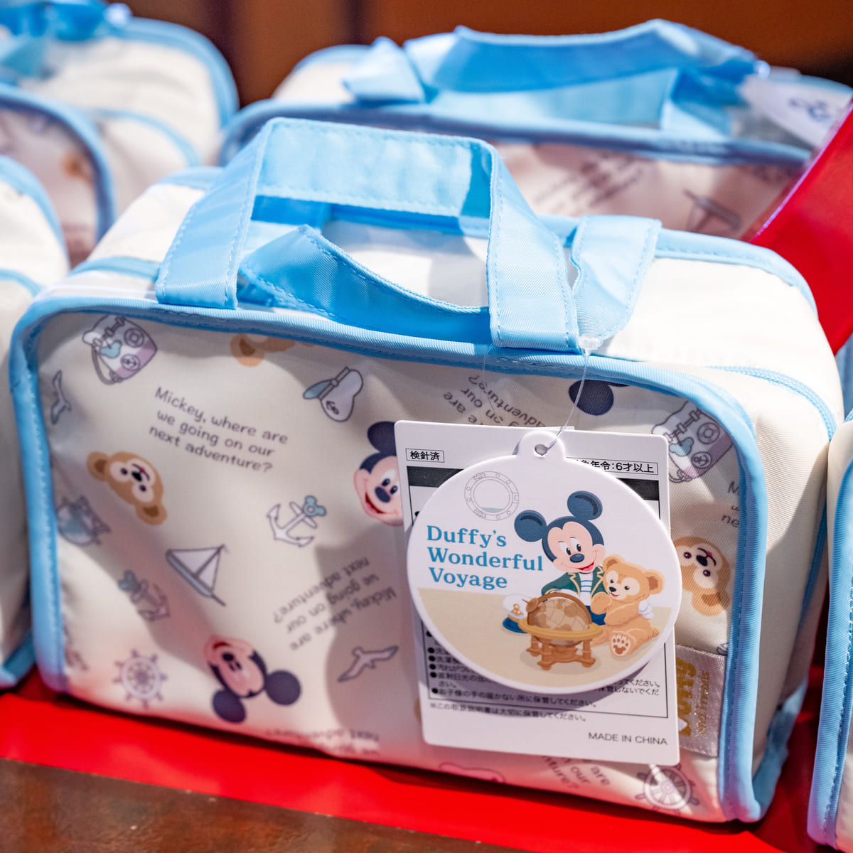 ダッフィーとミッキーマウスの航海の旅のシーンが描かれた「ダッフィーのワンダフル・ヴォヤッジ」スペシャルグッズ。