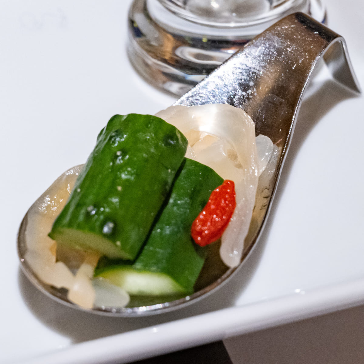 前菜四種は、くらげの冷菜ときゅうりの甘酢づけ、