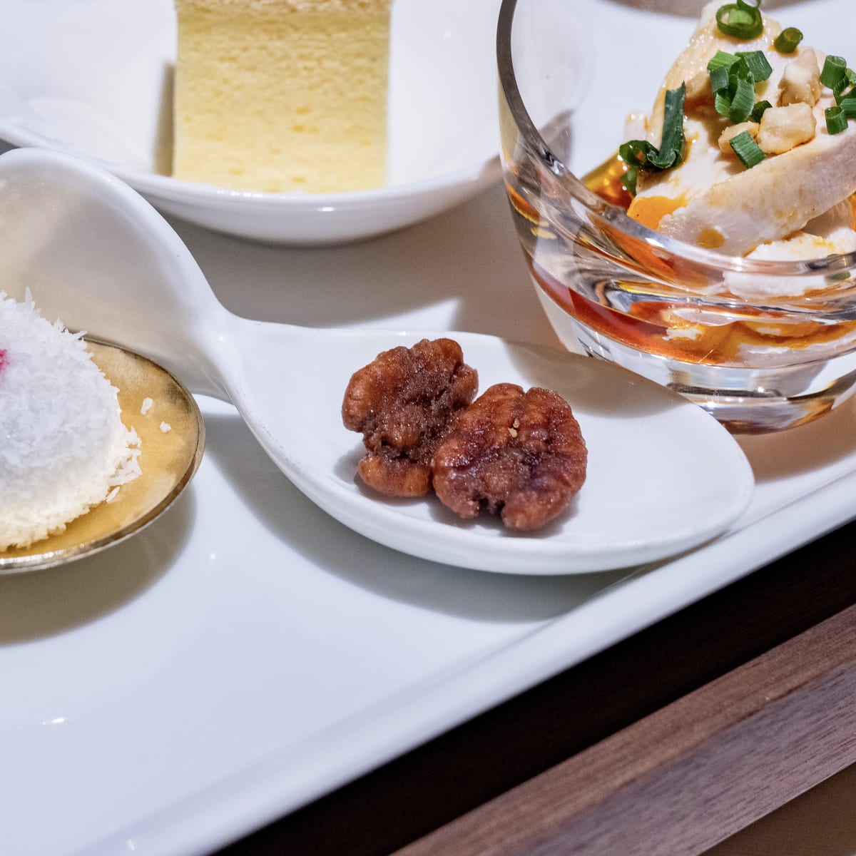 - デザートプレート(陳皮入りバナナムース/豆花と羅漢果のソース/杏露酒風味のチョコレートクリーム 茶巾包み/三色アイス)