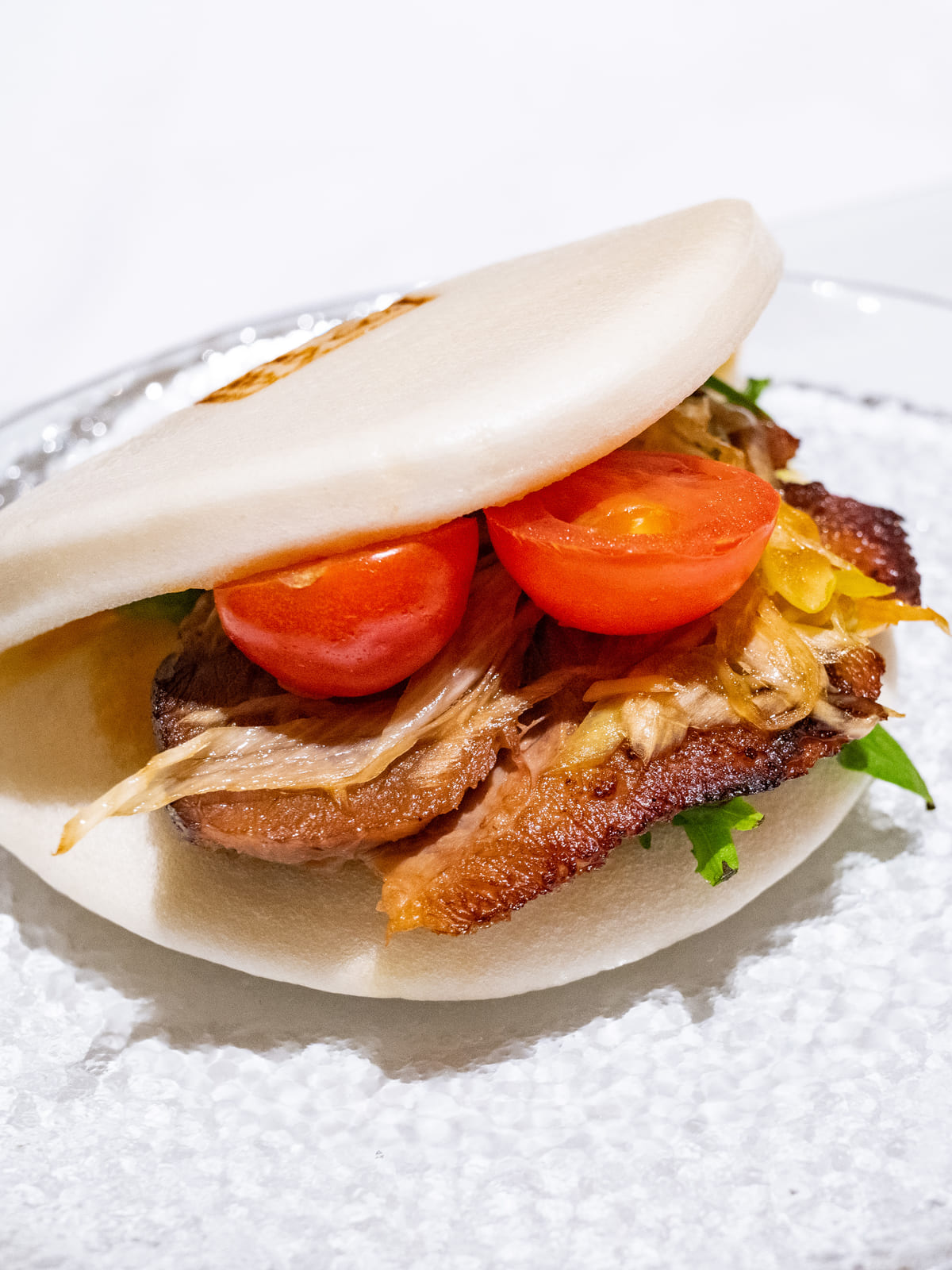 花巻と同じふわふわもちもちなパンズにサンドされた中華バーガー、割包(グァバオ)。