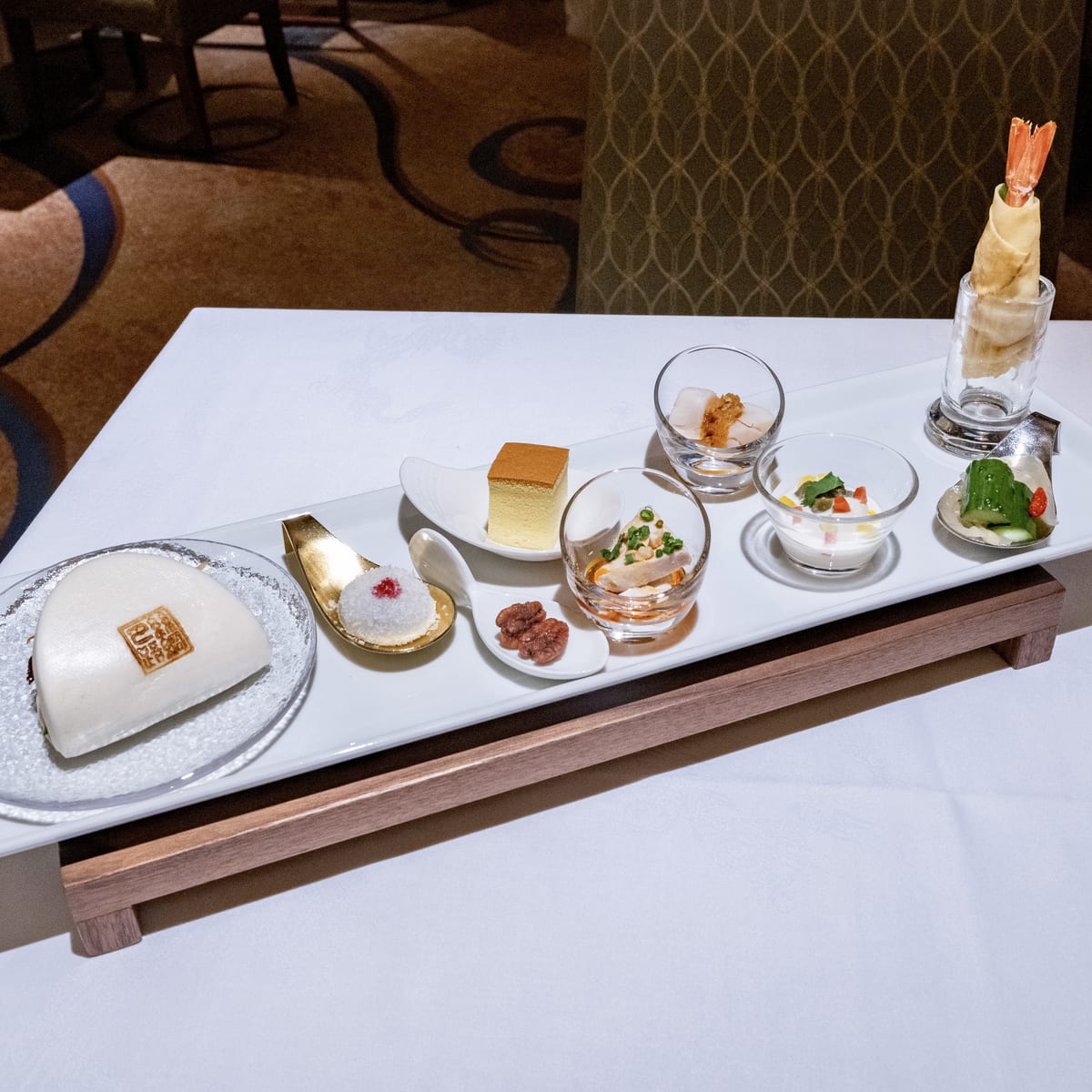 次に前菜四種、点心三種、海老と野菜のクレープ包み マヨネーズ風味、叉焼入り中華バーガー、中国菓子が提供されます。