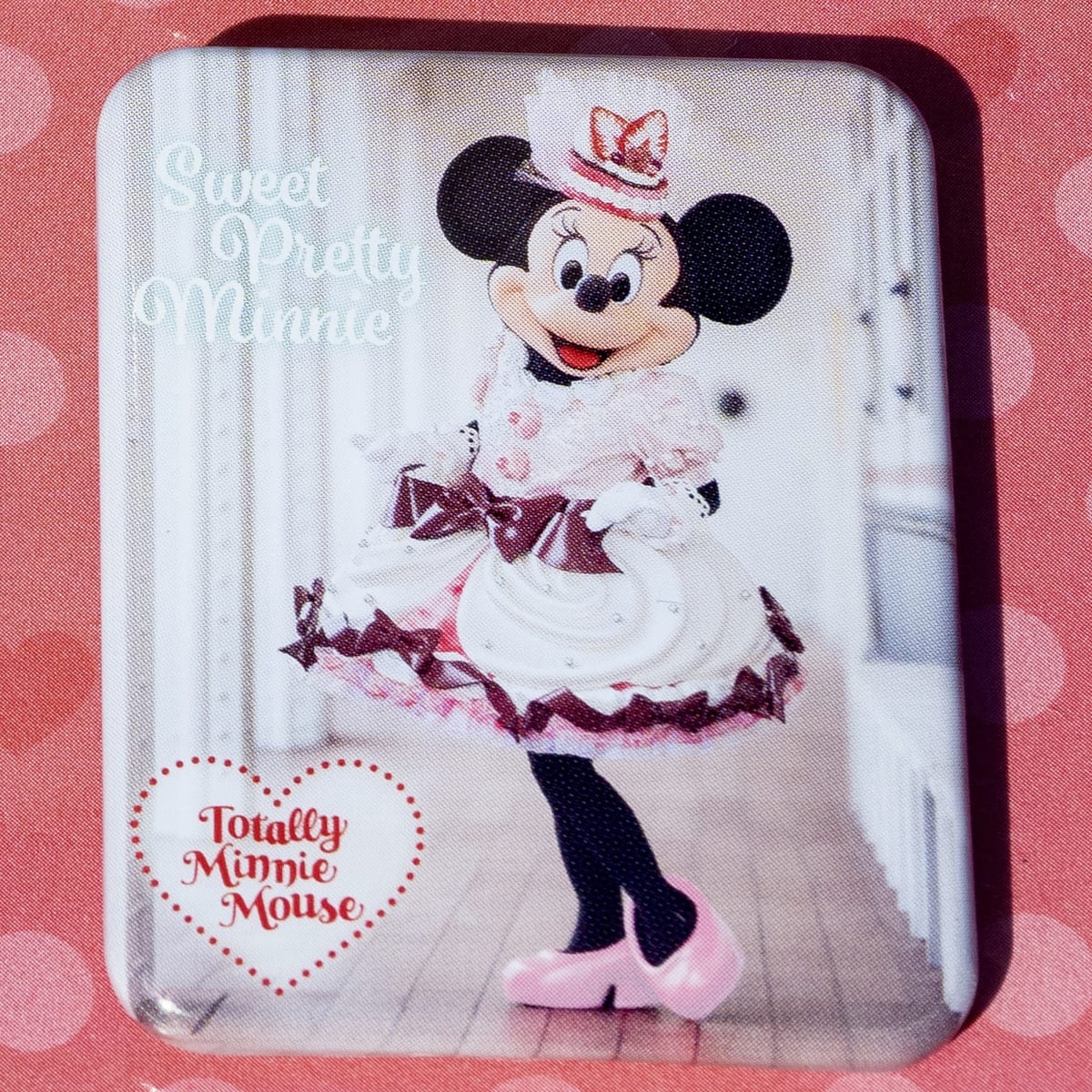 東京ディズニーシーの「テーブル・イズ・ウェイティング」のスウィーツコスチュームを着たミニーマウスのカンバッジ。