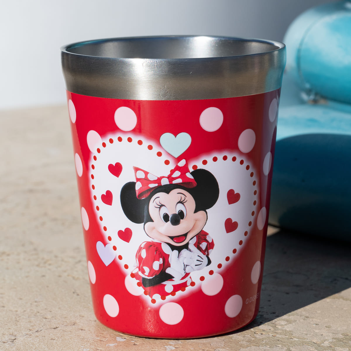 赤色ベースにドット、ハート柄がデザインされたミニーマウスらしいデザインのタンブラーです。
