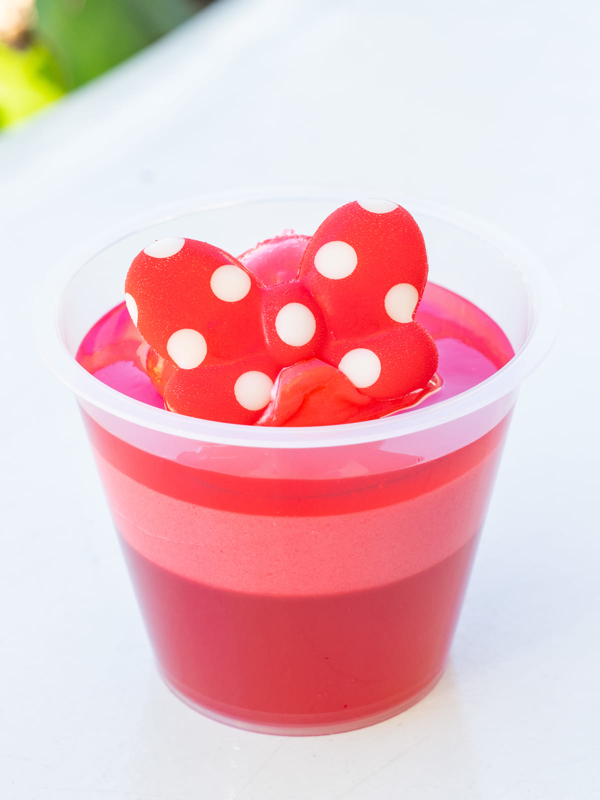 ミニーマウスモチーフのラズベリームース&ストロベリーゼリー、スーベニアカップ付き。