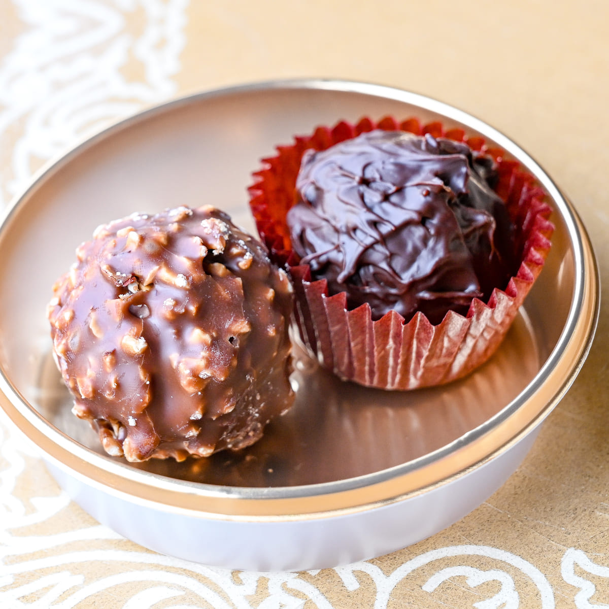 層になっていてサクサクとした食感も楽しめるヘーゼルナッツチョコレートとスウィートな味わいの上品でなめらかなチョコレートの2種が楽しめます。