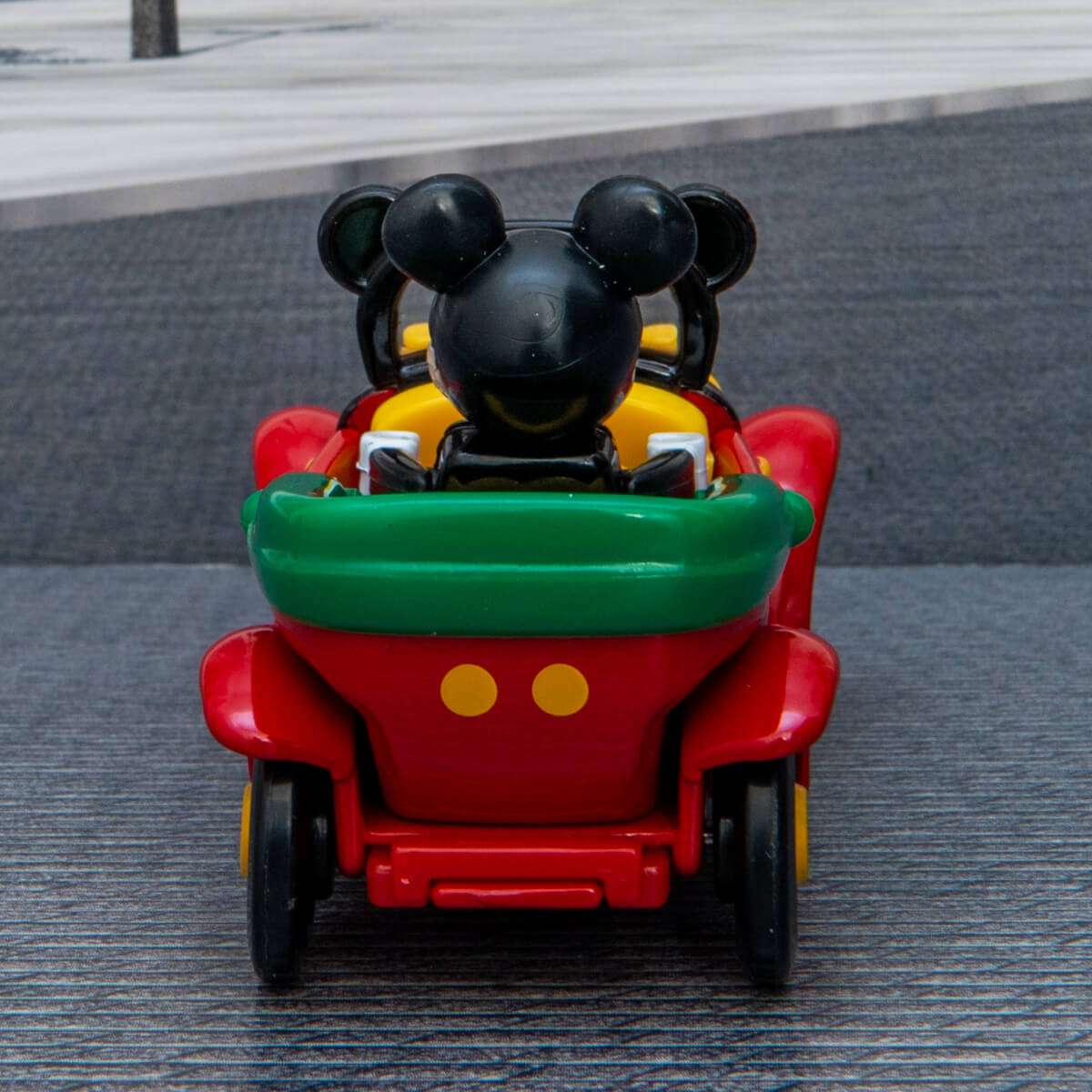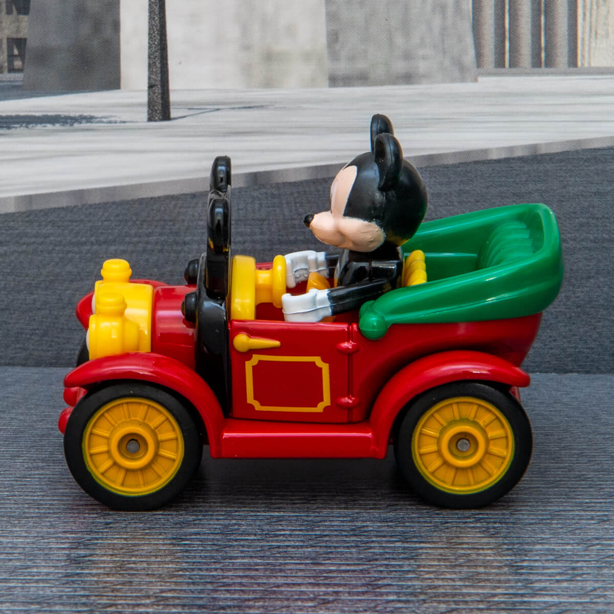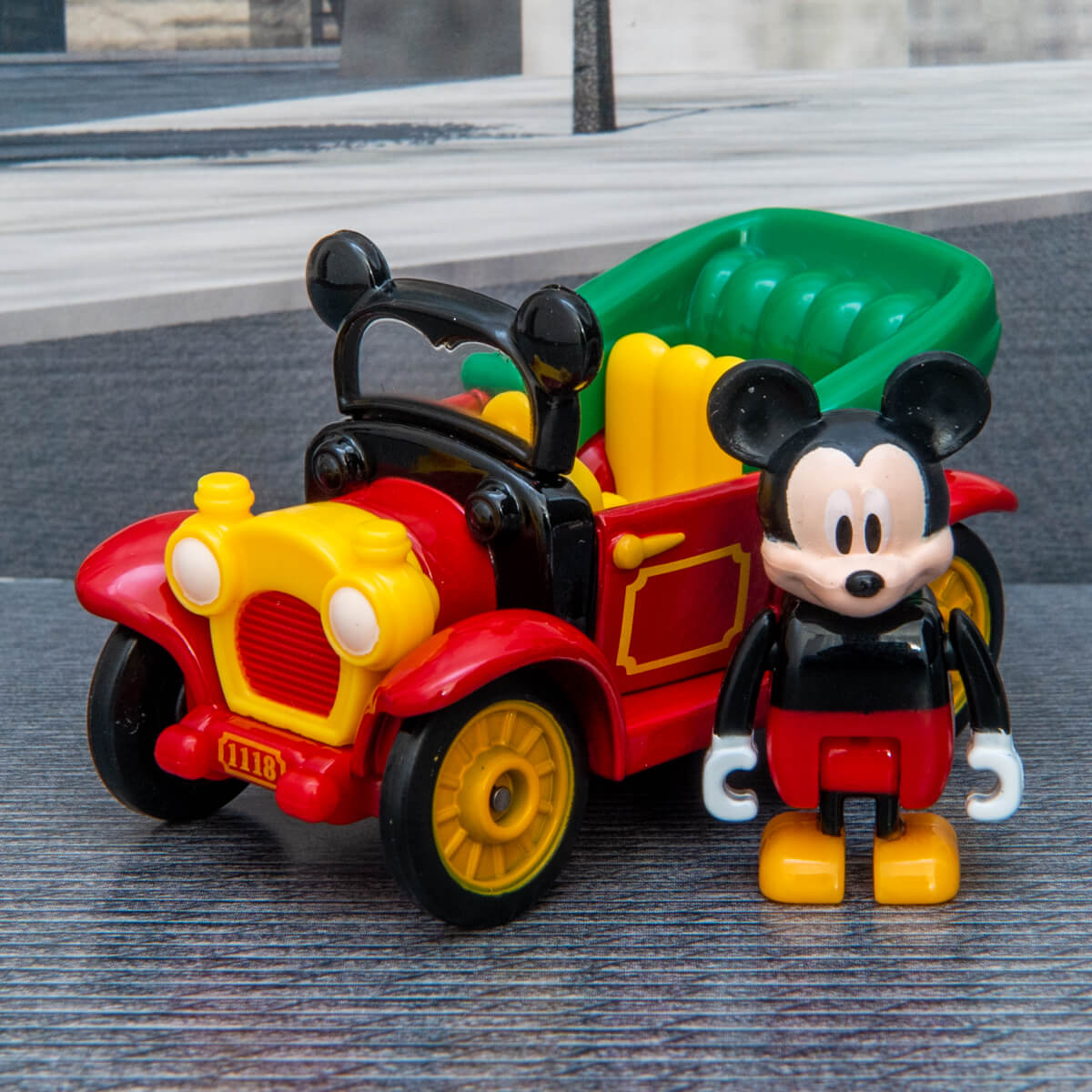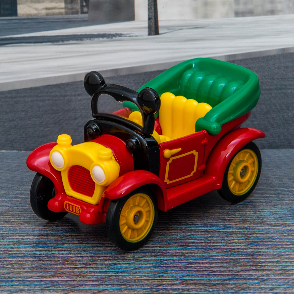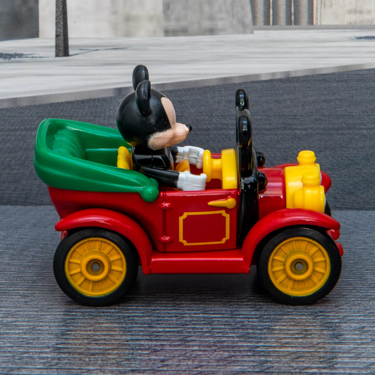 「トミカ」は、「ミッキーマウス」カラーの赤、黒、黄色と緑色をつかったクラシックカー。