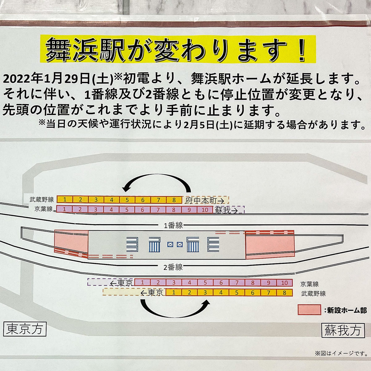 これに伴い、上下線ともに京葉線(10両)は約2両分、武蔵野線(8両)は約3両分、列車停車位置が変更。