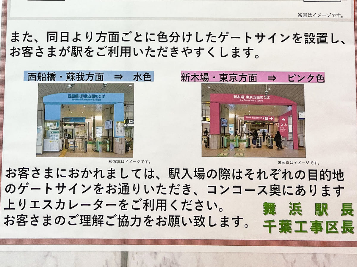 東京方面側、蘇我・西船橋方面側ともに列車停車位置の変更に伴い、コンコース階の案内サインの改修も実施!