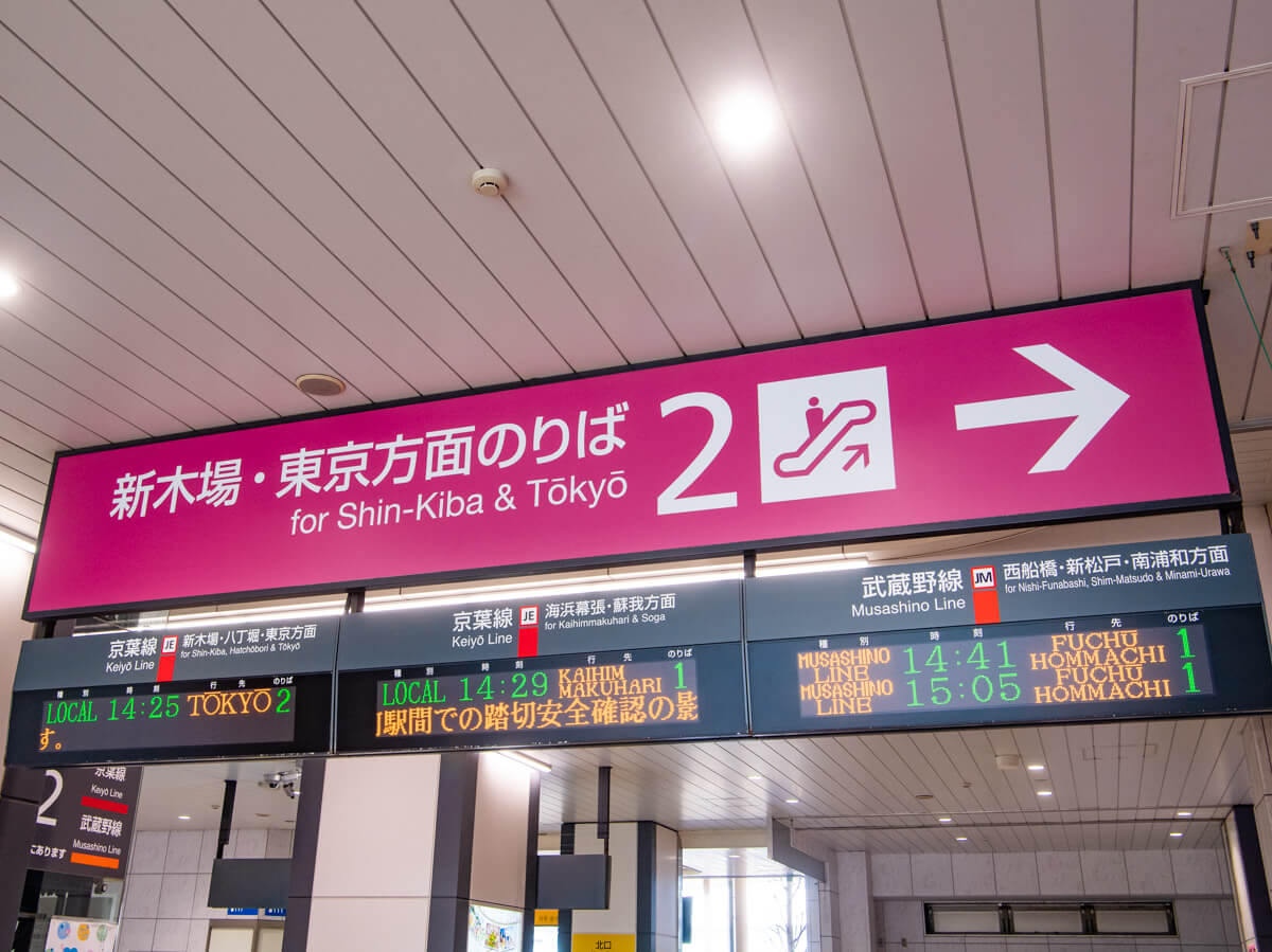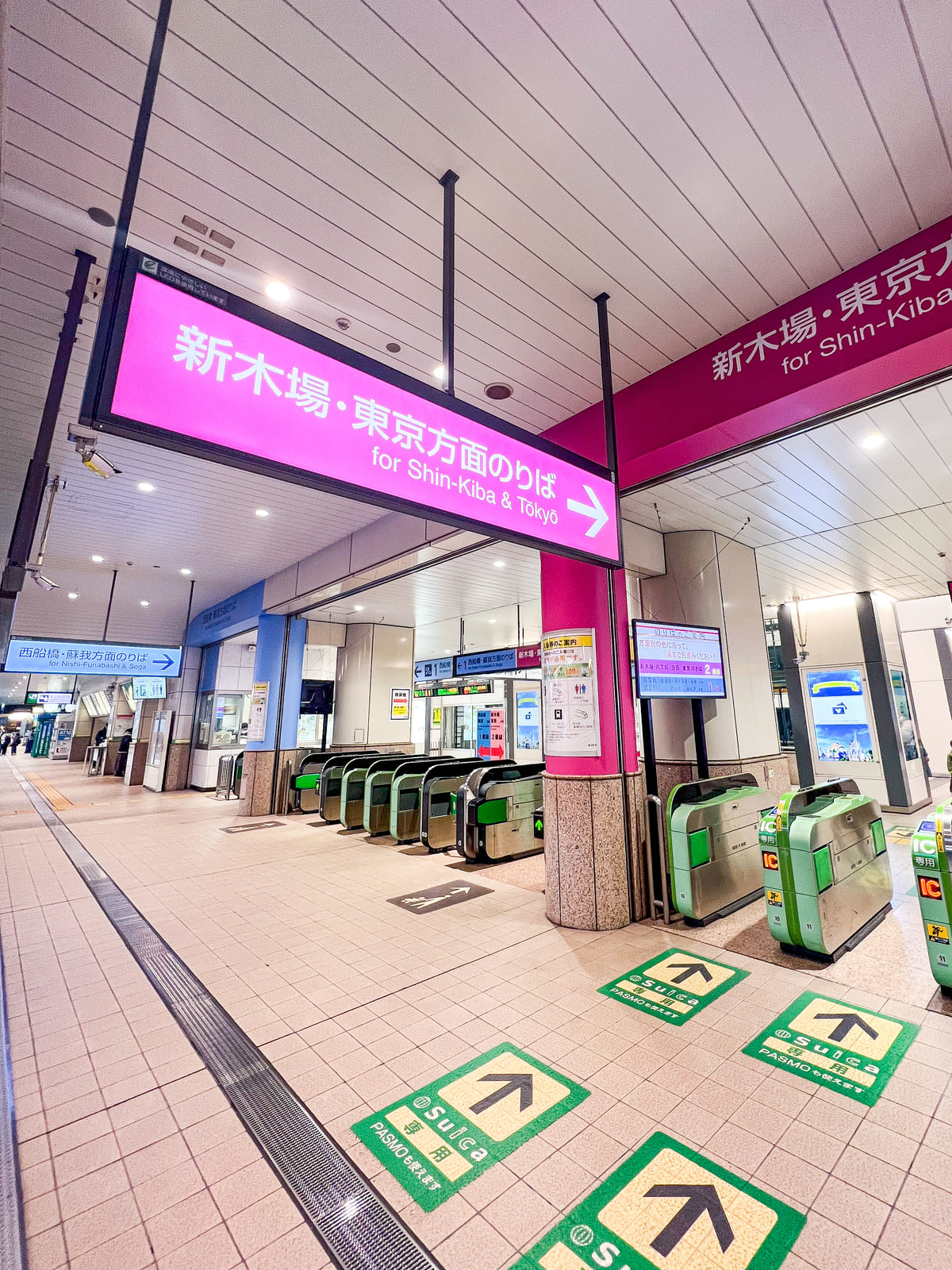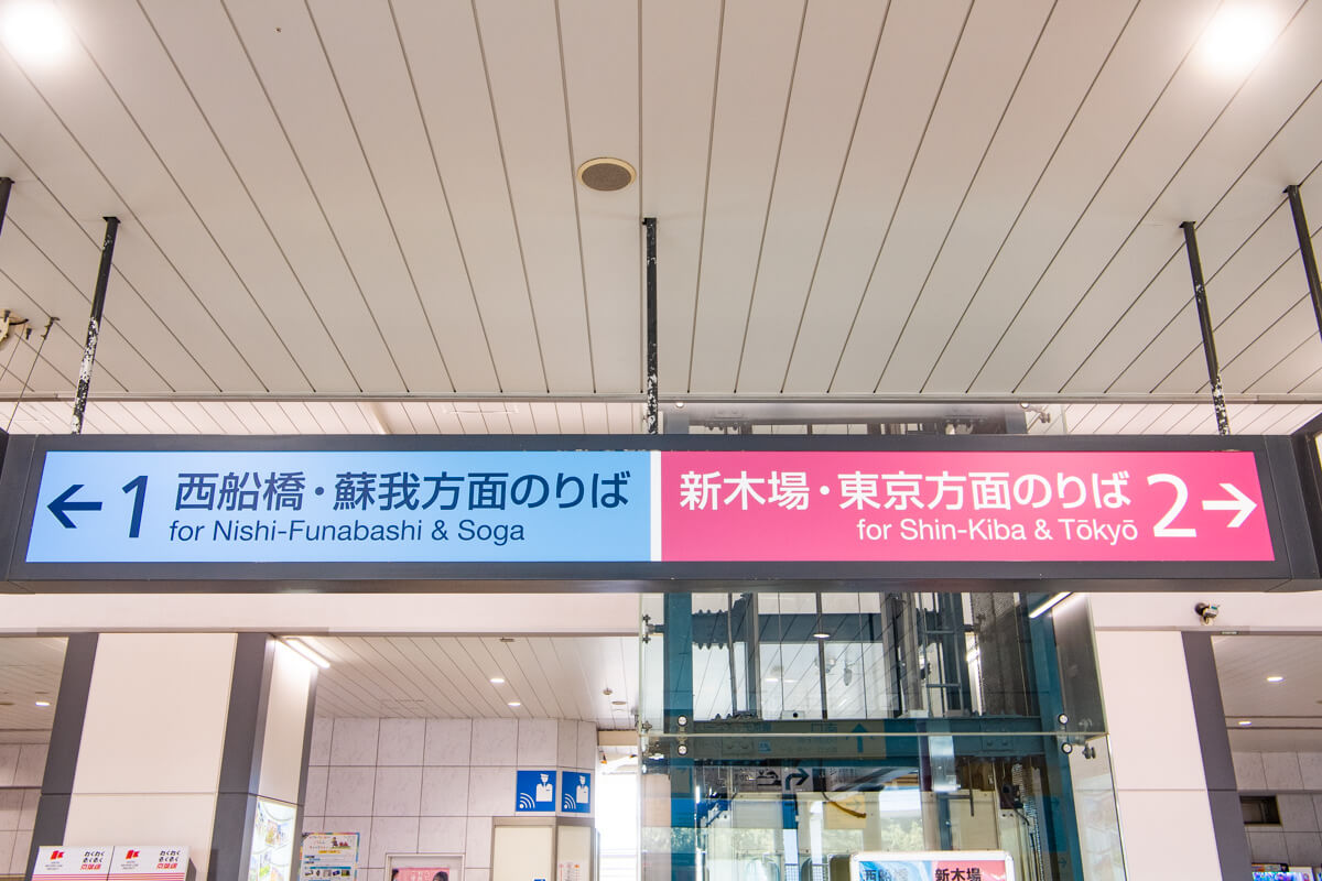 西船橋・蘇我方面のりばの改札案内サインは青色になっています。