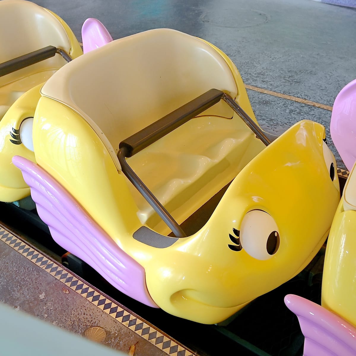 黄色い体に紫色のヒレ、かわいいまつげがポイントのトビウオ型ライドをそのまま再現☆