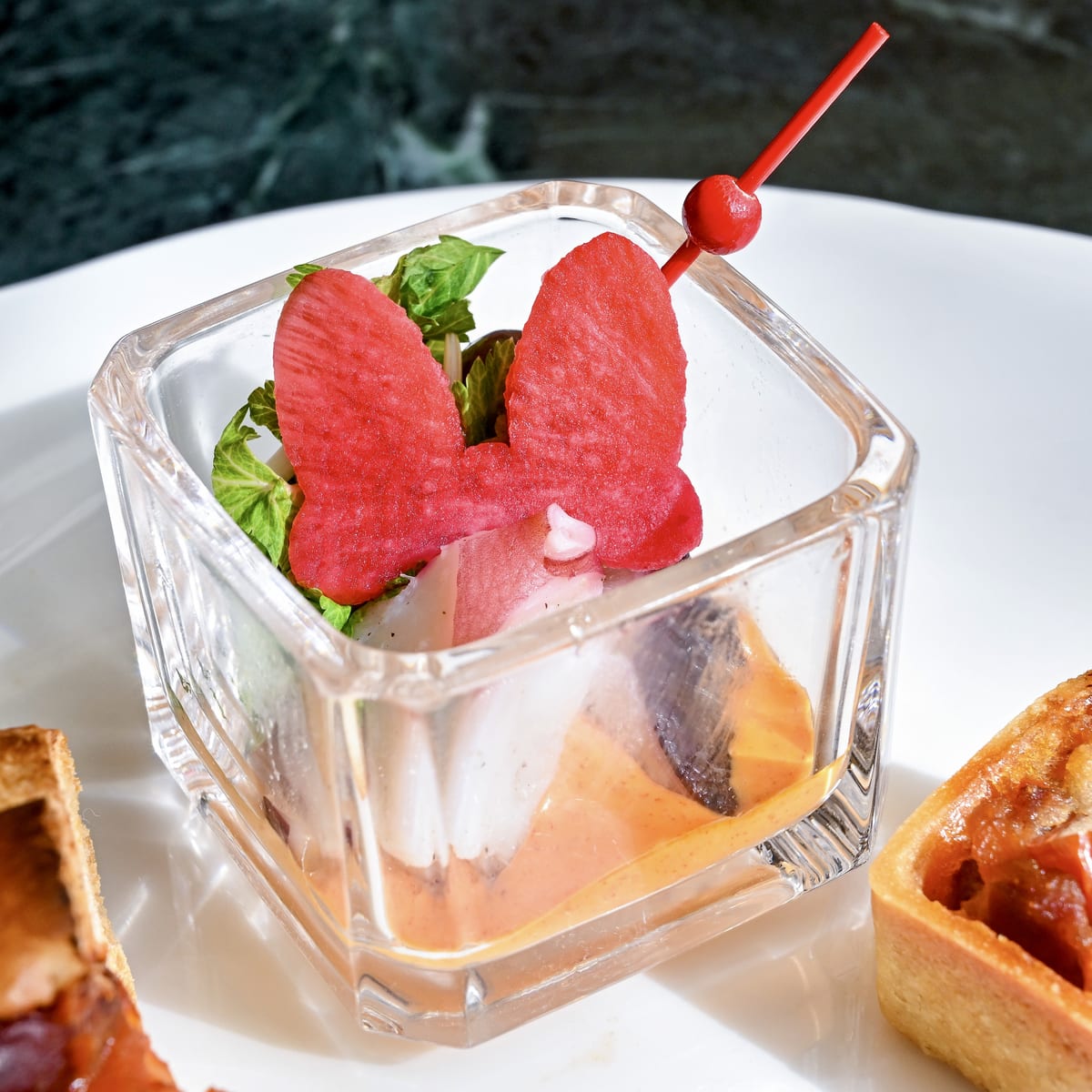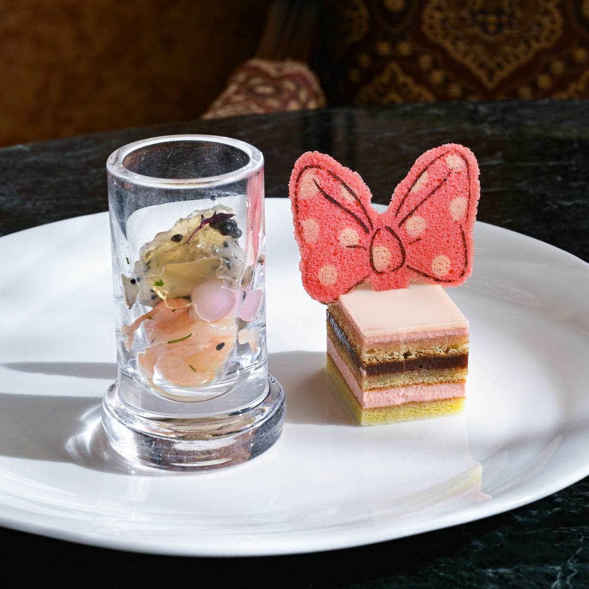 ミニーマウスらしいドット柄のリボンがかわいいデザートとオードヴル。