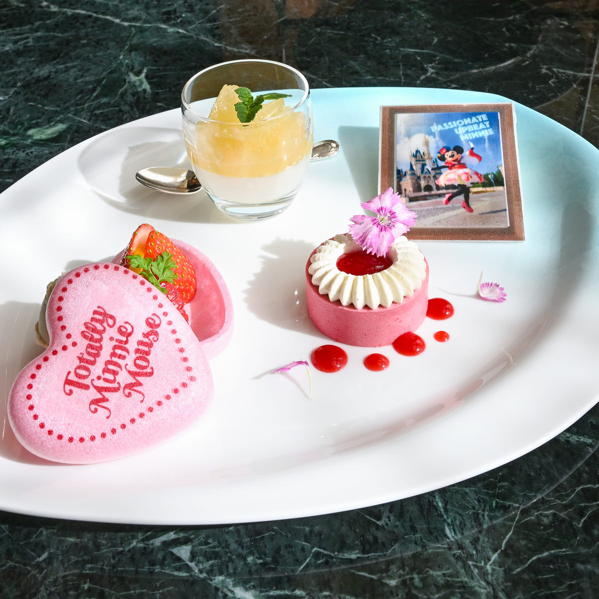 デザートプレートは夏らしいブルーとミニーマウスらしいピンクの盛り付け。