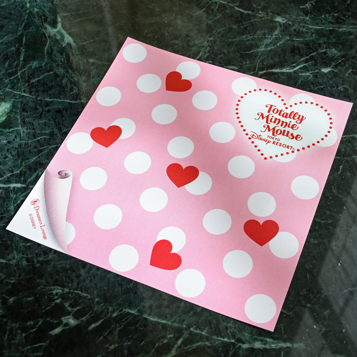 敷き紙は"トータリー・ミニーマウス"のロゴ、ドリーマーズ・ラウンジのロゴ、ドット、ハートの総柄です。