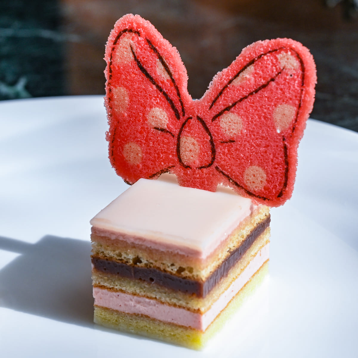 ミニーマウスの頭飾りのような華やかなデコレーションのラズベリームース。