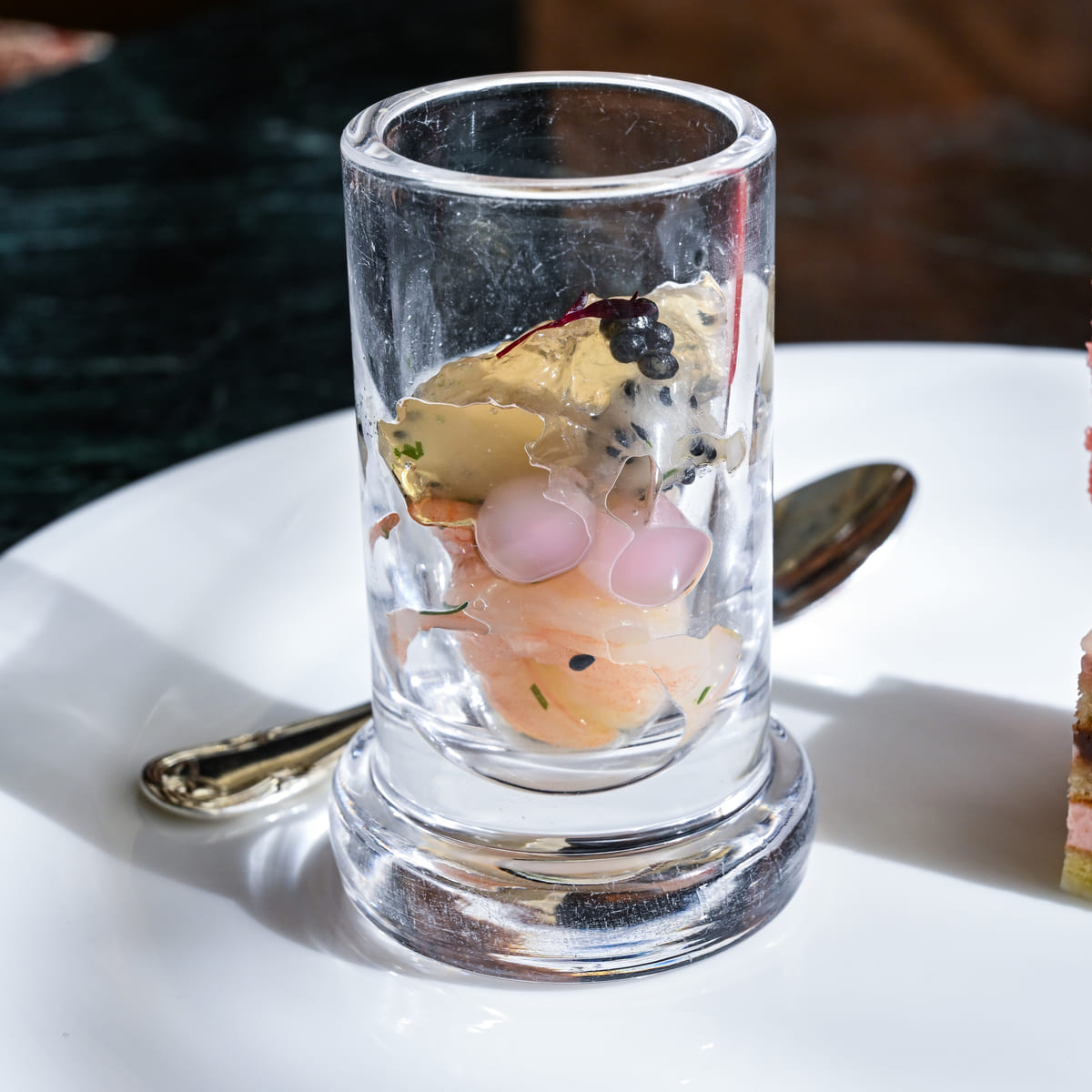 トロピカルなドラゴンフルーツ、エビ、ピンクのタピオカ入りのさっぱりいただけるグラスメニューです。