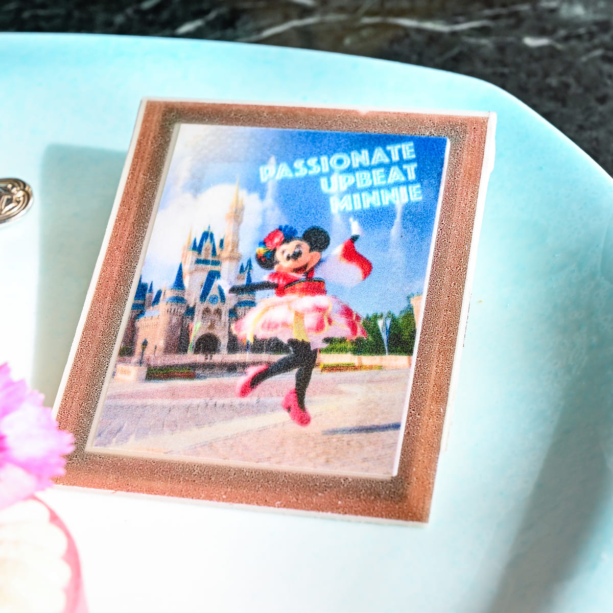 チョコレートにはシンデレラ城をバックにジャンプする彩涼華舞コスチュームのミニーマウス☆