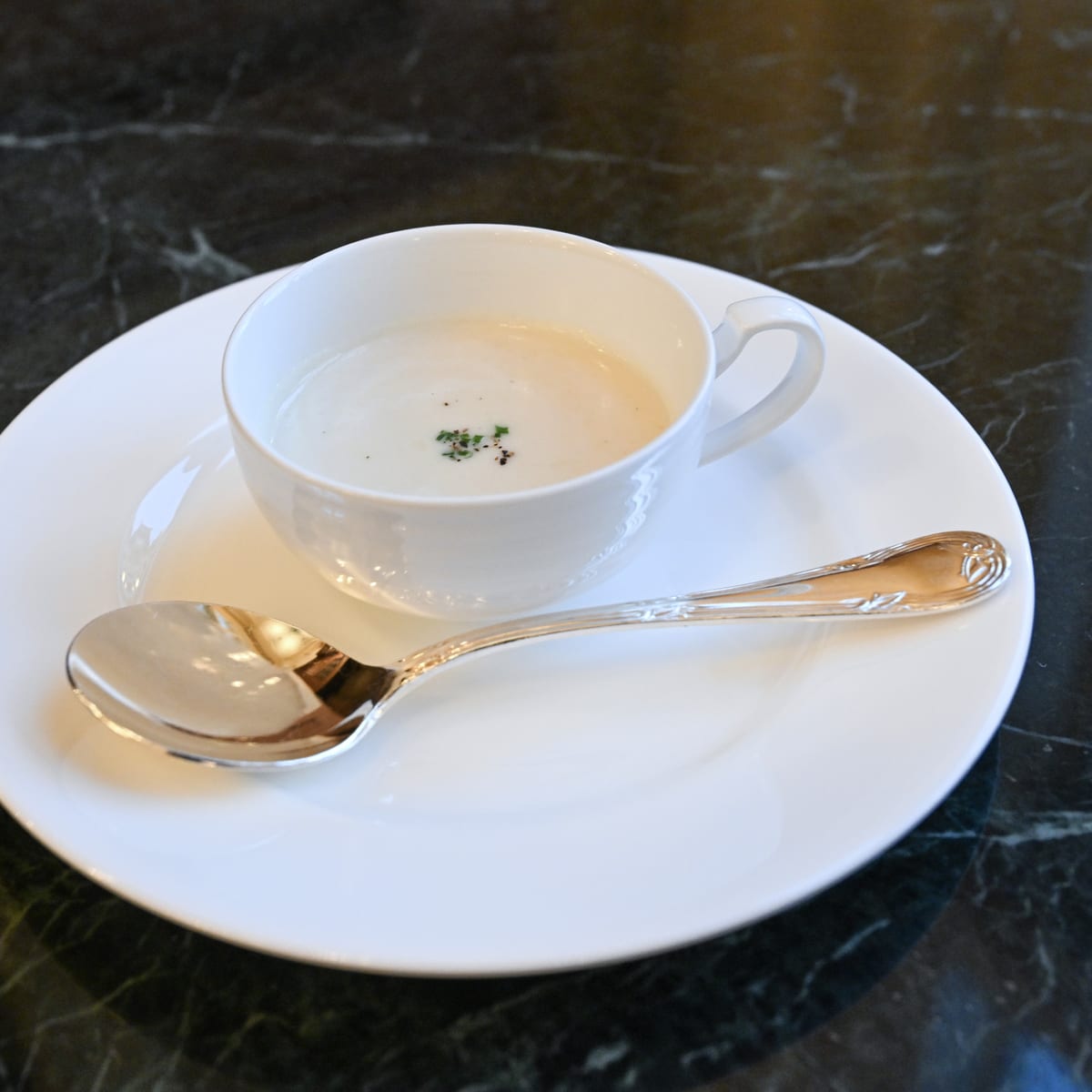 あたたかいスープはアサリとカリフラワーのクリーミーなスープ。