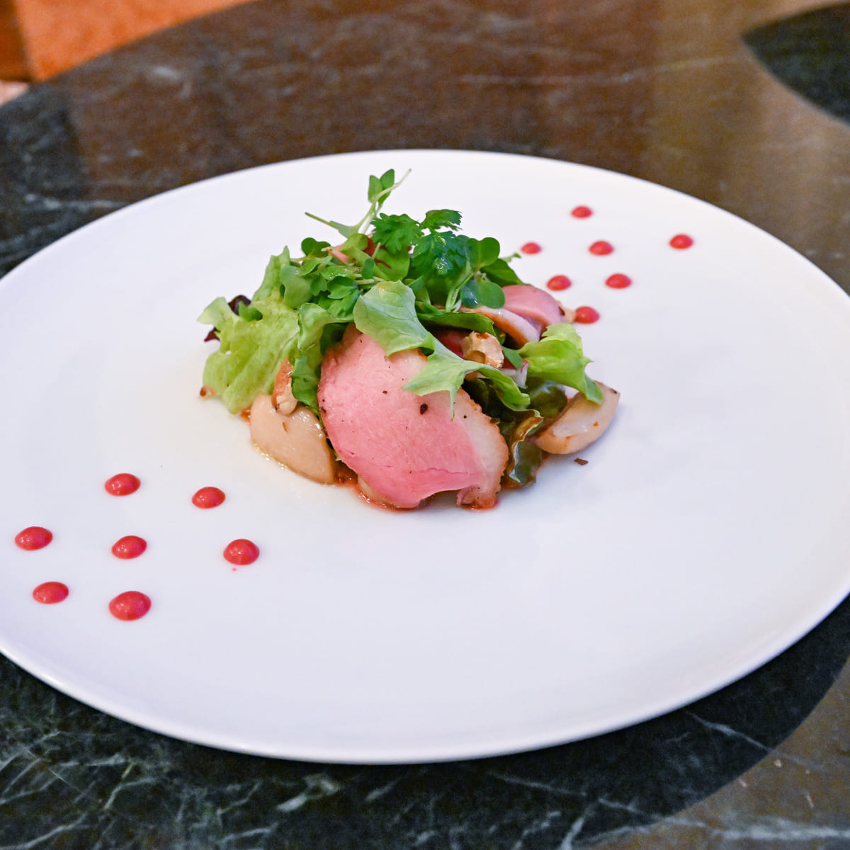 前菜は"合鴨ローストのサラダ仕立て ベリーマスタードのヴィネグレット"