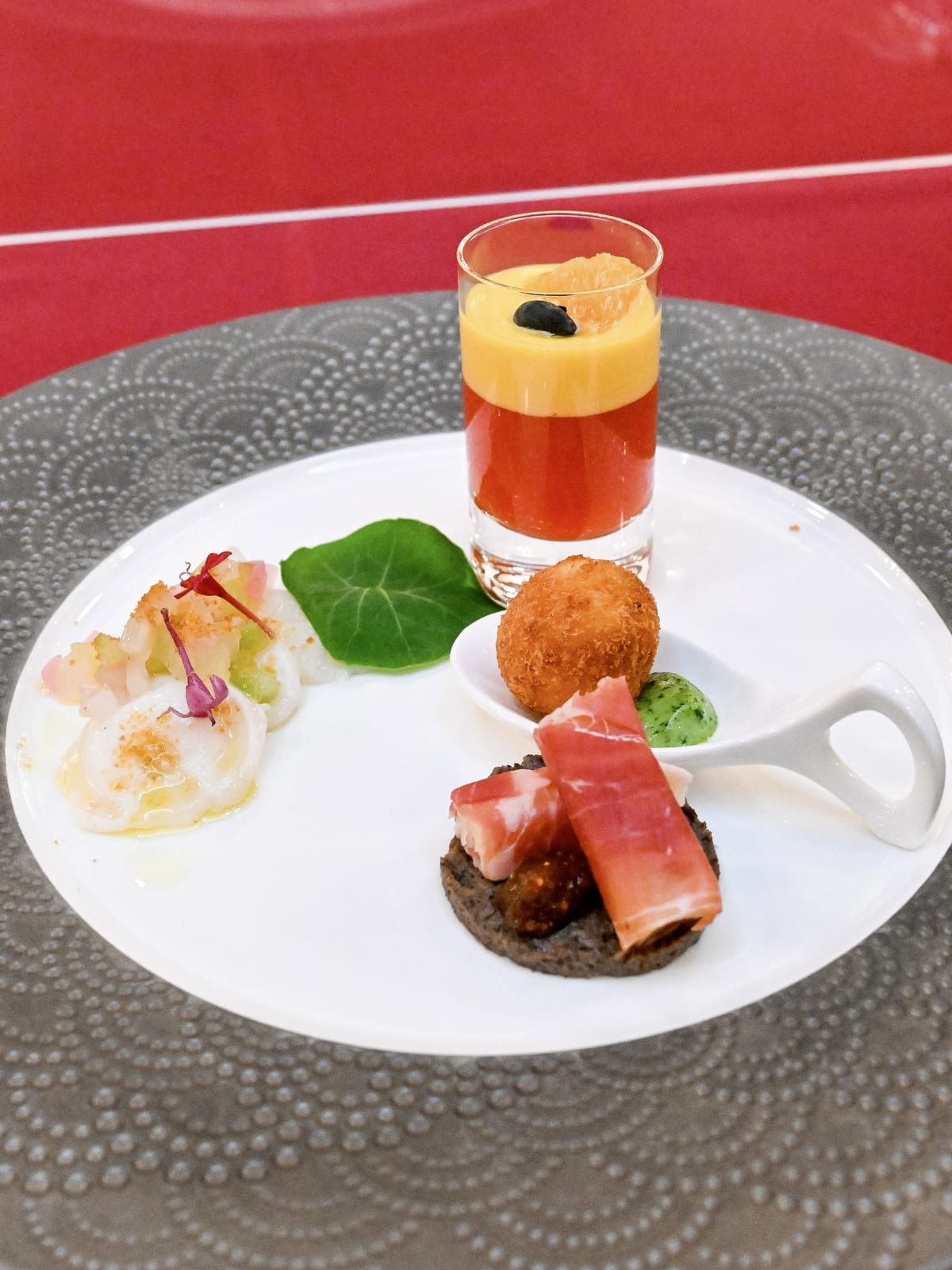 ショットグラスにはスペインの国旗のカラ―の赤と黄色のガスパチョ、生ハムで巻いたスペイン産のマンチェゴチーズ、クロケット、さっぱりしたミズダコのスペイン風シーフードマリネです。