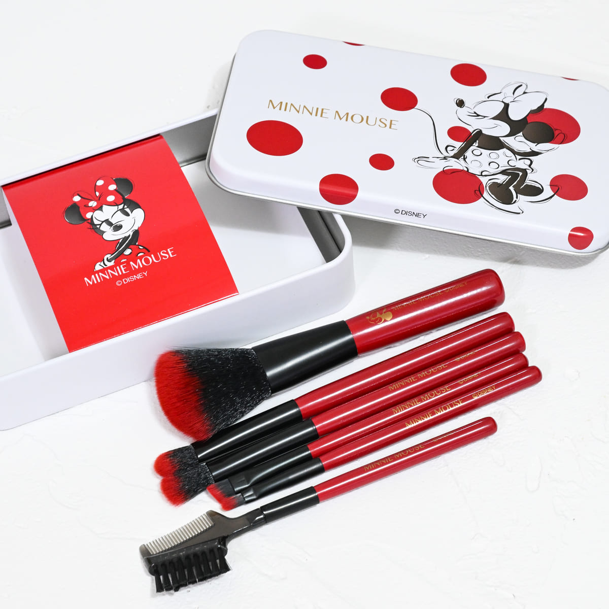 赤×黒のメイク用のブラシやコームにはミニーマウスの名前やお顔がデザインされています。
