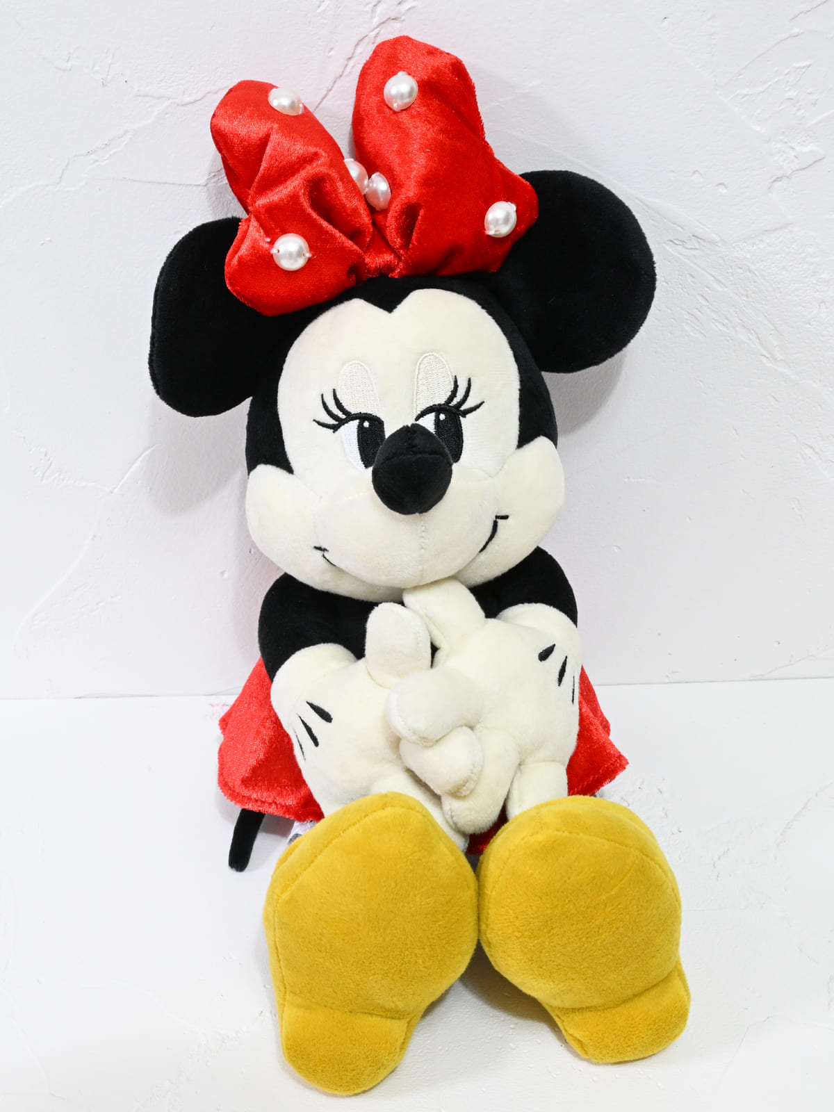 長いまつげが魅力的な「ミニーマウス」のぬいぐるみ。